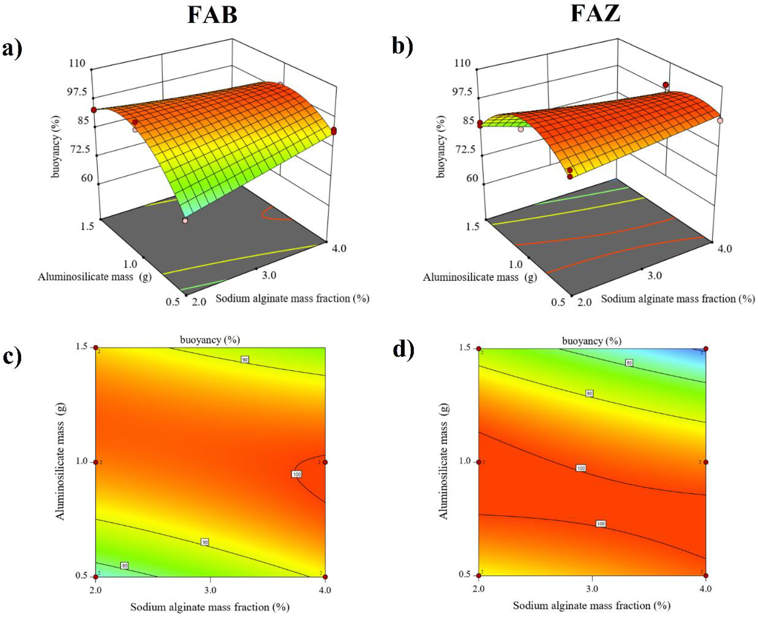The response surfaces (Figure 2(a) and (b)) and the corresponding contour plots (Figure 2(c) and (d)) for the set of synthesized composites confirm the aforementioned findings. An optimal flotation region was observed under intermediate to high aluminosilicate mass condition (∼1.0 g) combined with a 4% alginate fraction. The surface corresponding to