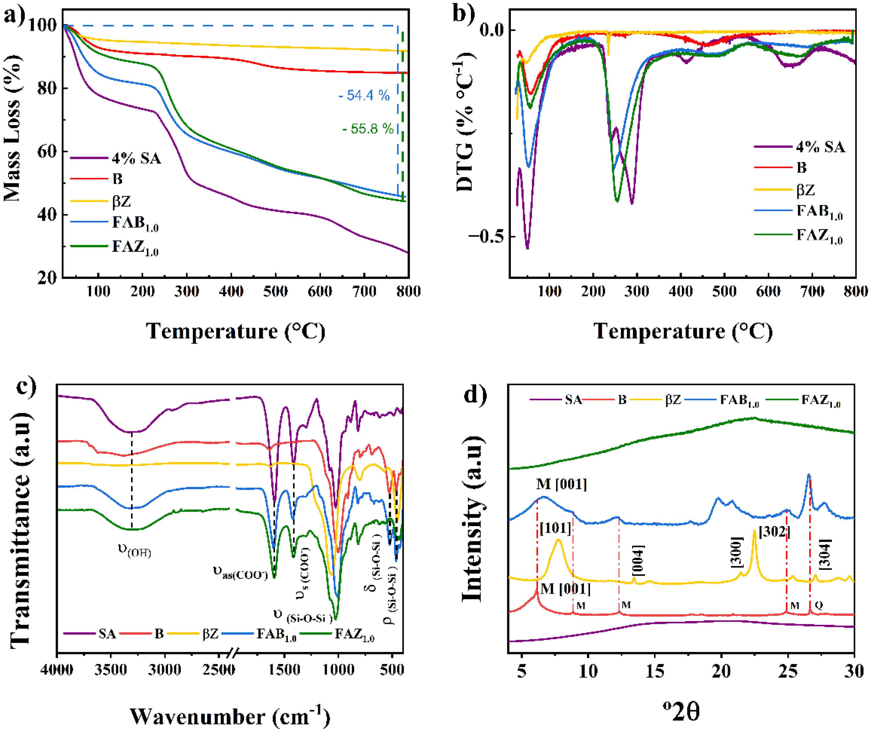 The XRD analysis (Figure 3(d)) revealed a contrasting structural behavior between the FAB1.0 and FAZ1.0 composites. The FAB1.0 composite retained diffraction peaks characteristic of bentonite (Figure 3(d), red line) corresponding to montmorillonite and quartz phases (M and Q), indicating partial intercalation of the biopolymer within the montmorillonite layers rather than complete exfoliation. This effect is consistent with the decrease in the basal spacing of the [001] reflection from