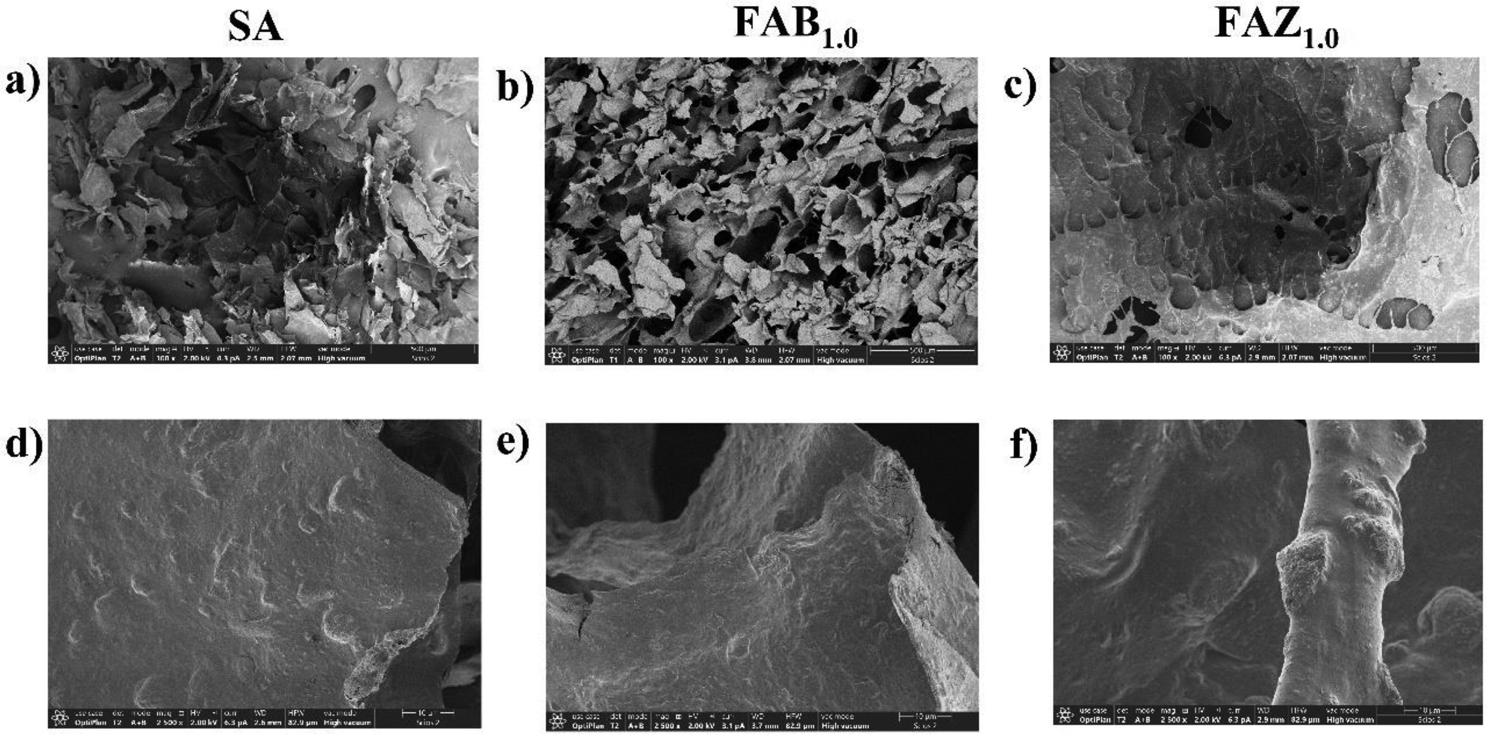 FE-SEM micrographs at the macroscale (500 µm) revealed remarkable structural contrasts among the materials (Figure 4(a)–(c)). The SA sponge (SA, Figure 4(a)) exhibited a homogeneous porous network with large, well-defined cavities, which is characteristic of freeze-dried gels without inorganic loading. This open architecture is consistent with the features observed at the microscale (10 µm) (Figure 4(d)) and indicates good pore connectivity. However, such structures typically present limited mechanical strength, as commonly reported for freeze-dried alginate hydrogels (Wang et al., 2022c). In contrast, the FAB1.0 composite (Figure 4(b)) displayed a denser macrostructure with partially collapsed regions and scarce visible porosity. This morphology is consistent with the homogeneous incorporation of laminar bentonite particles and the rough surface observed at the microscale (Figure 4(e)). The presence of bentonite promotes the formation of a more compact framework, which arises from strong interactions between alginate carboxylate groups and clay surfaces. Similar structural features have been described for alginate–montmorillonite nanocomposites and are associated with improved cohesion of the polymeric matrix (H. Zhang et al., 2020a). The FAZ1.0 composite (Figure 4(c)) exhibited a markedly heterogeneous macrostructure, characterized by crystalline aggregates and irregular pore distribution. These features correlate with the limited dispersion of
