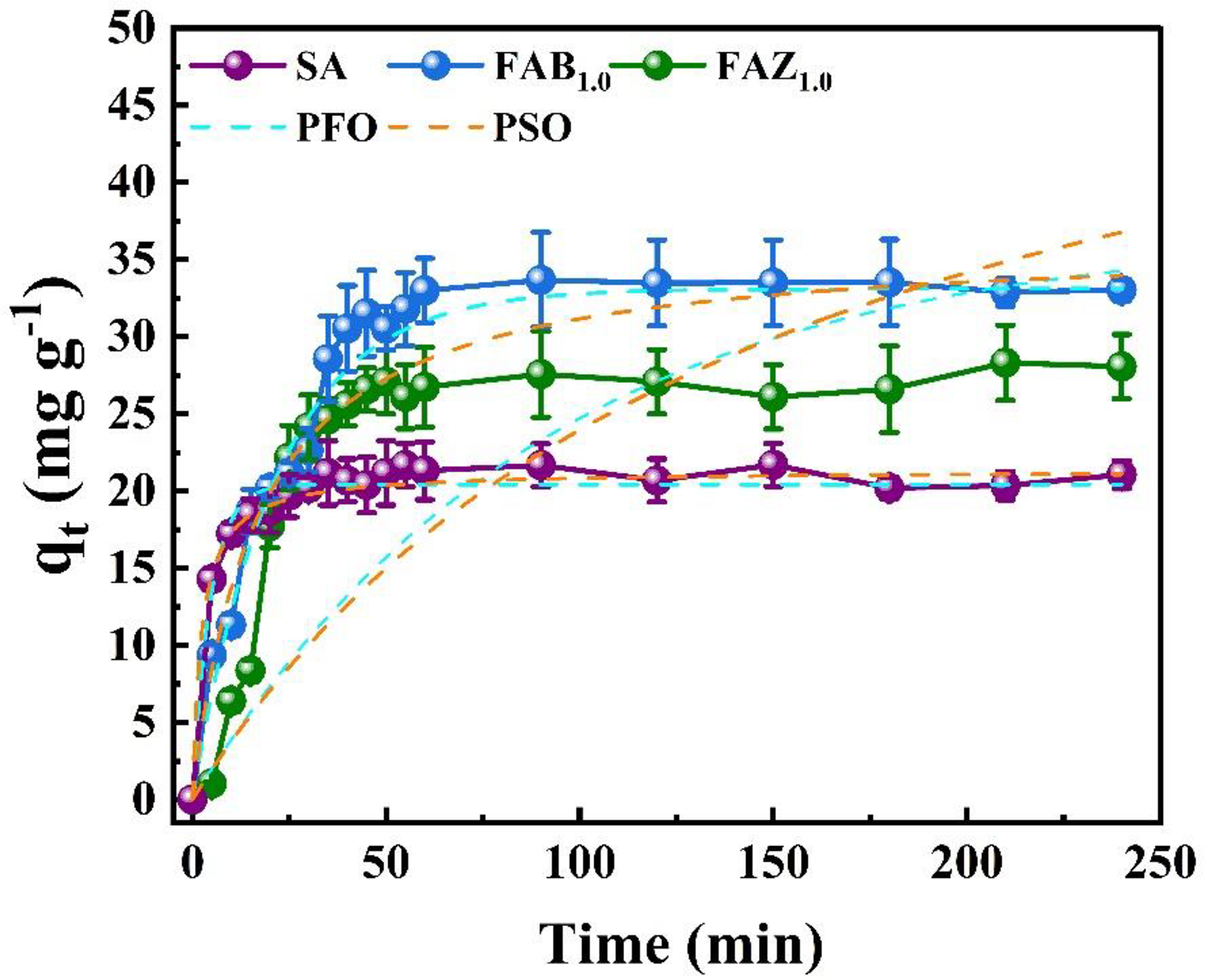 Adsorption kinetics of Hg(II) onto SA, FAB1.0, and FAZ1.0 composites fitted to nonlinear PFO and PSO models. Experimental conditions: [Hg(II)]0 = 200 mg L−1, pH 6.5, adsorbent dosage of 250 mg per 100 mL solution. PFO: pseudo-first-order; PSO: pseudo-second-order; FAB: floating alginate–bentonite; FAZ: floating alginate–
