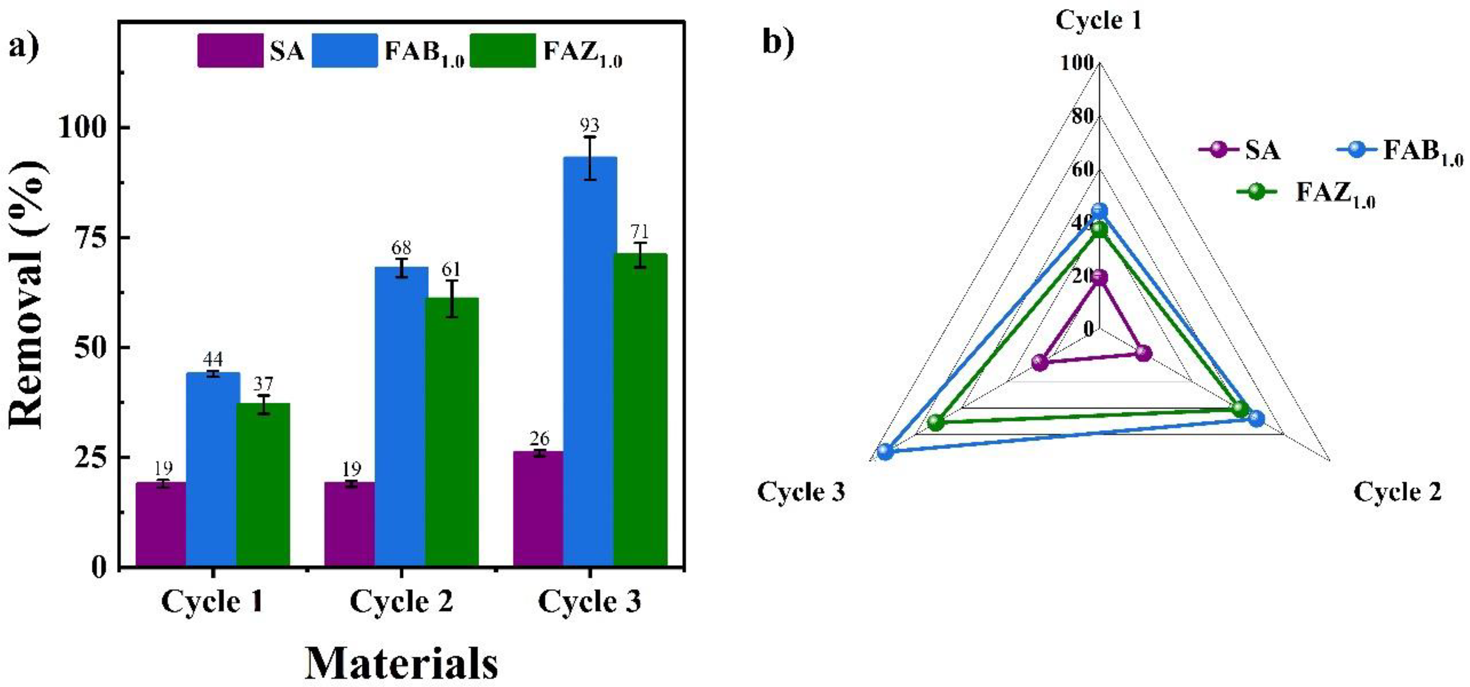 (a) Removal efficiency of Hg(II) over three reuse cycles for SA, FAB1.0, and FAZ1.0; (b) Radar plot comparison of cyclic performance. FAB: floating alginate–bentonite; FAZ: floating alginate–