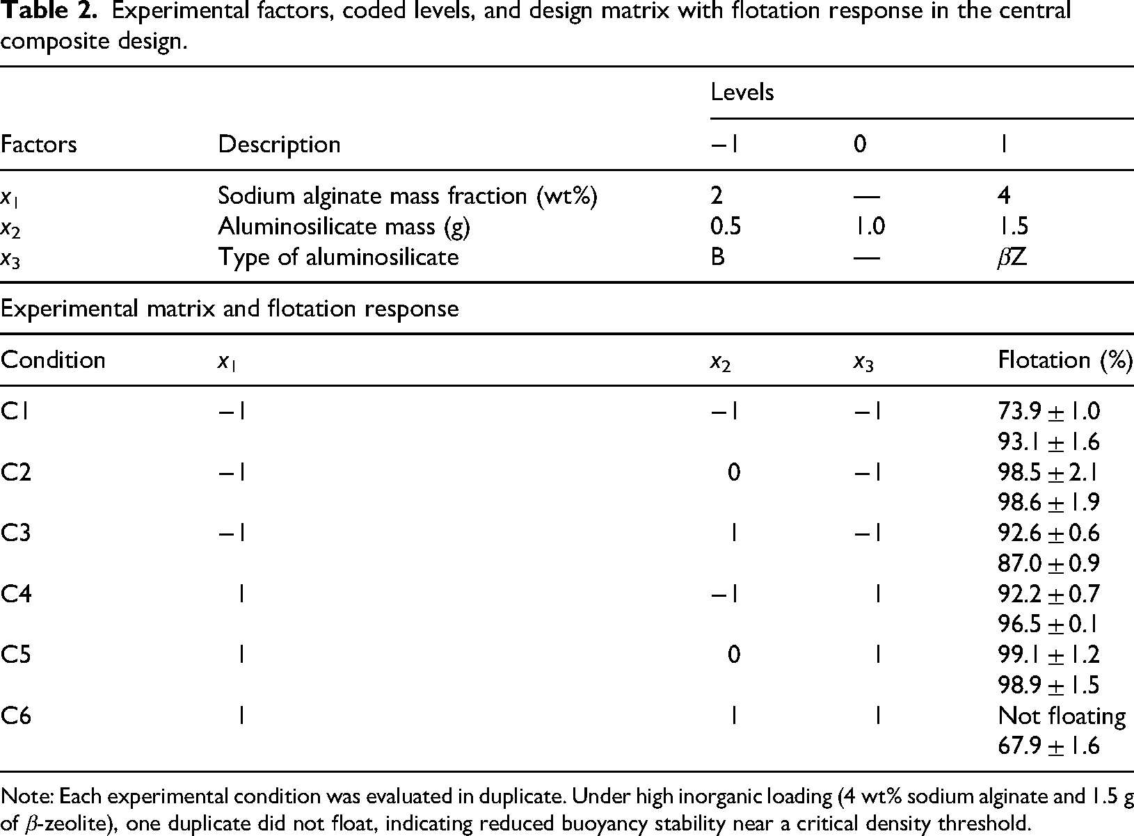 The optimization of composite buoyancy was evaluated using a full factorial CCD with three independent factors: SA mass fraction (