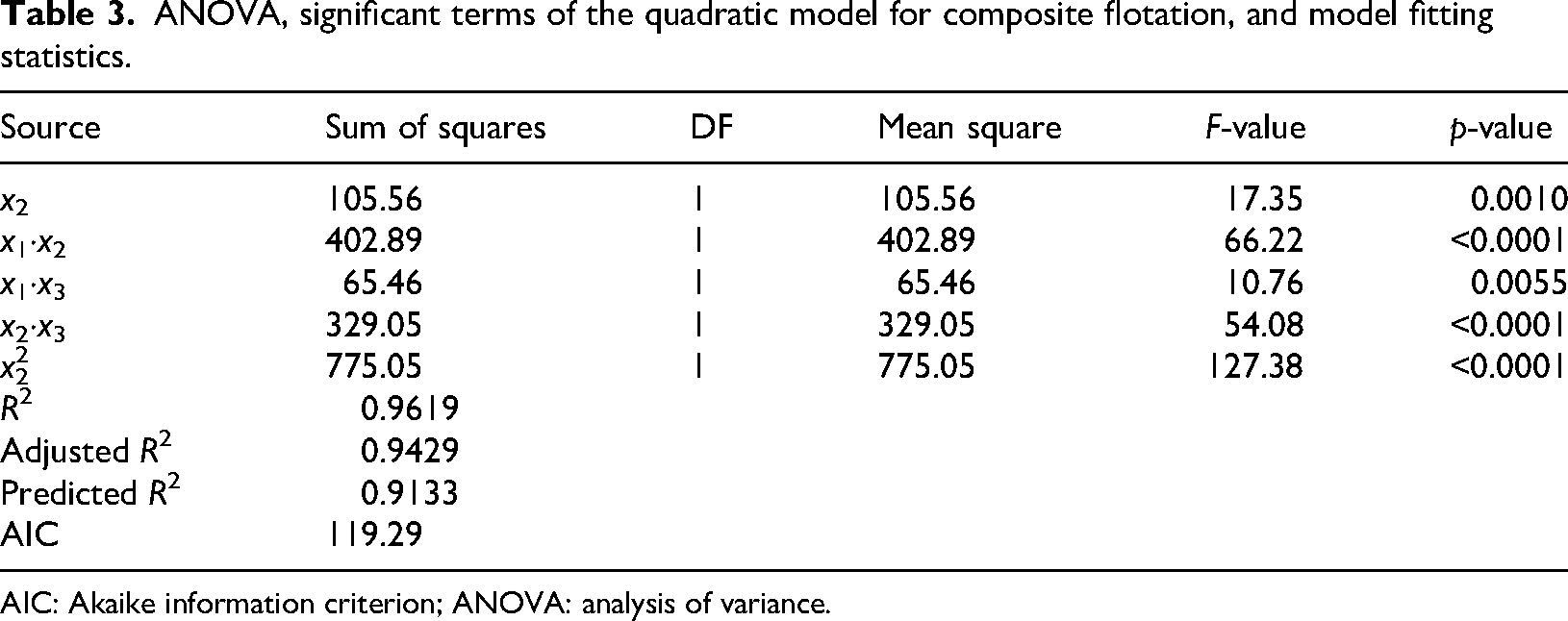 The ANOVA for the significant terms of the quadratic model (Table 3) revealed a statistically significant relationship between the independent variables and the flotation of the composites (