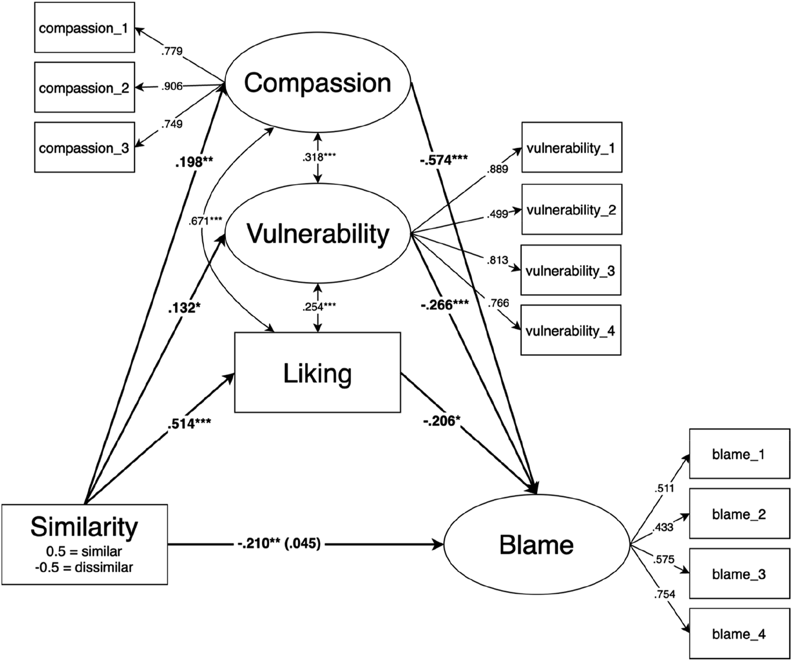 The full SEM including the measurement model and regression paths is depicted in Figure 1. Structural equation model including the measurement model and regression paths of the indirect effect of similarity (condition) on blame via vulnerability, liking, and compassion.