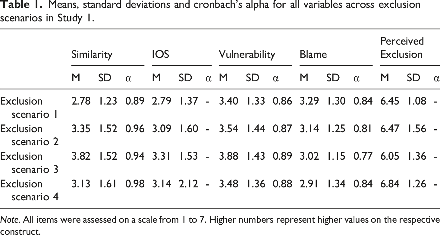 Means, standard deviations and cronbach’s alpha for all variables across exclusion scenarios in Study 1.