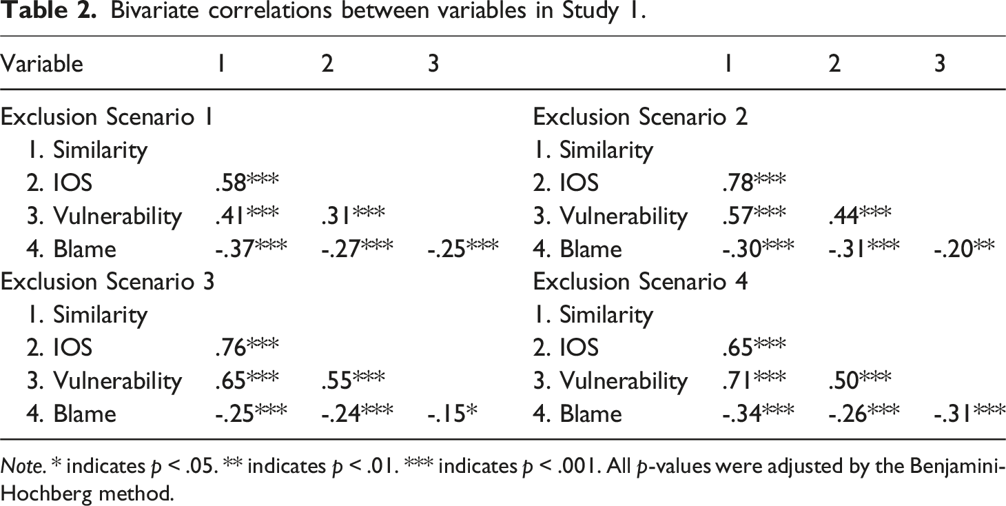 In support of Hypothesis 1, there was a significant association between similarity and blame in that the more similar participants felt to the target person, the less they blamed the target person for the exclusion, β = -.35, 95%CI = [-.40, -.29],