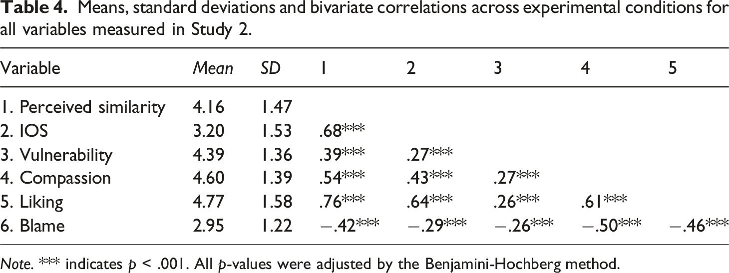 Due to Study 1’s correlational design, causal inference about the associations between similarity and blaming have to be treated with caution. Yet, the pattern of association is consistent with the theoretical tenet of blame avoidance in defensive attribution theory (Shaver, 1970), indicating that individuals blame a target person less the more they expect to potentially end up in a similar situation in the future. This is likely driven by participants’ impression that they share similarities in their behavioral tendencies with the target person (i.e., experiential similarity). In line with prior theorizing (Pinciotti & Orcutt, 2020), the strong association between similarity and perceived vulnerability in Study 1 may indicate a strong overlap between these two constructs.