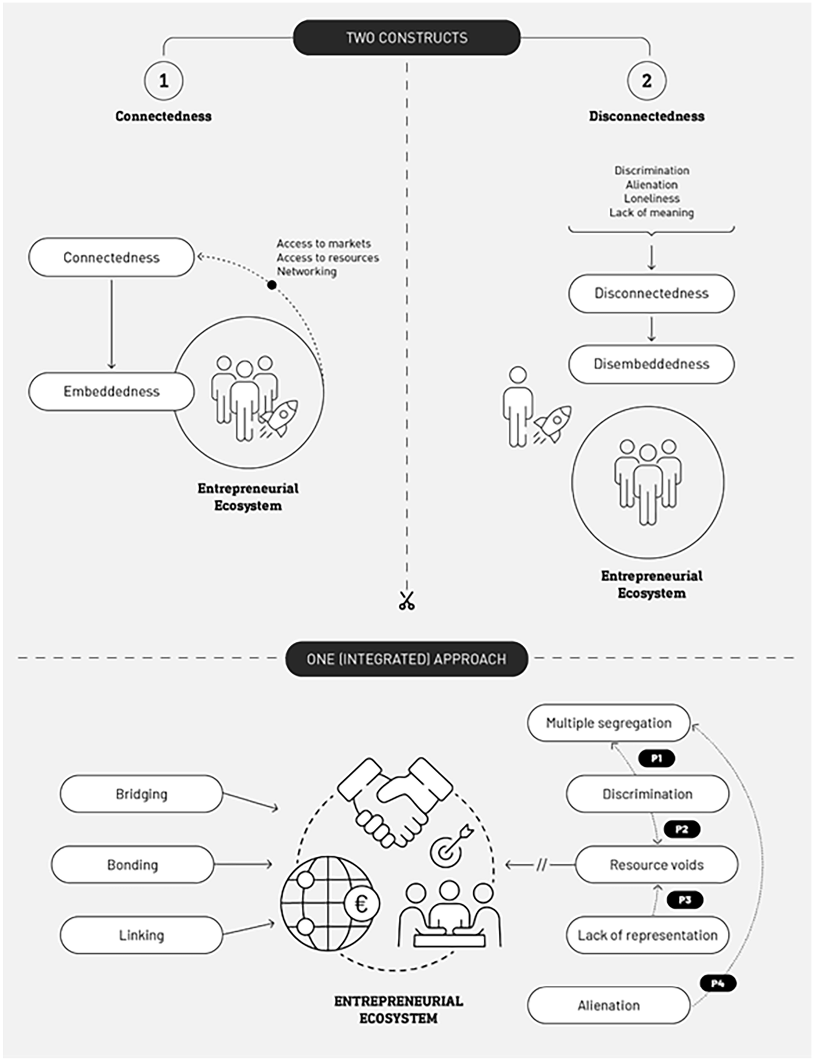 From a social capital perspective, connectedness manifests in bonding, bridging and linking (Coleman, 1988; Tahlyan et al., 2022; Woolcock, 2001). According to Adler and Kwon (2002), social capital provides goodwill through social relations and supports taking action. Lacking social capital through disconnectedness hampers MEs building trust (Nooteboom, 2007) and thus, filling structural holes (Burt, 2000). Related to this and the resource-garnering character of social capital, lacking access to resources relevant to developing entrepreneurial endeavours works in the same way with a more destructive impact on venturing due to resources that speed down the development process of the venture or prevent ME from attaining their development goals (Ozkazanc-Pan, 2022). While bonding fosters community and shared identity, bridging enables access to diverse resources and knowledge, and linking connections provides essential support from institutions (Woolcock, 2001). Balancing and leveraging these forms significantly affect an entrepreneur’s success in an ecosystem. Disconnectedness, conversely, rests on the absence of such relationships. According to Bellingham et al. (1989), disconnectedness results in loneliness, self-alienation and a lack of meaning and [or] purpose. Figure 1 summarises the two concepts.