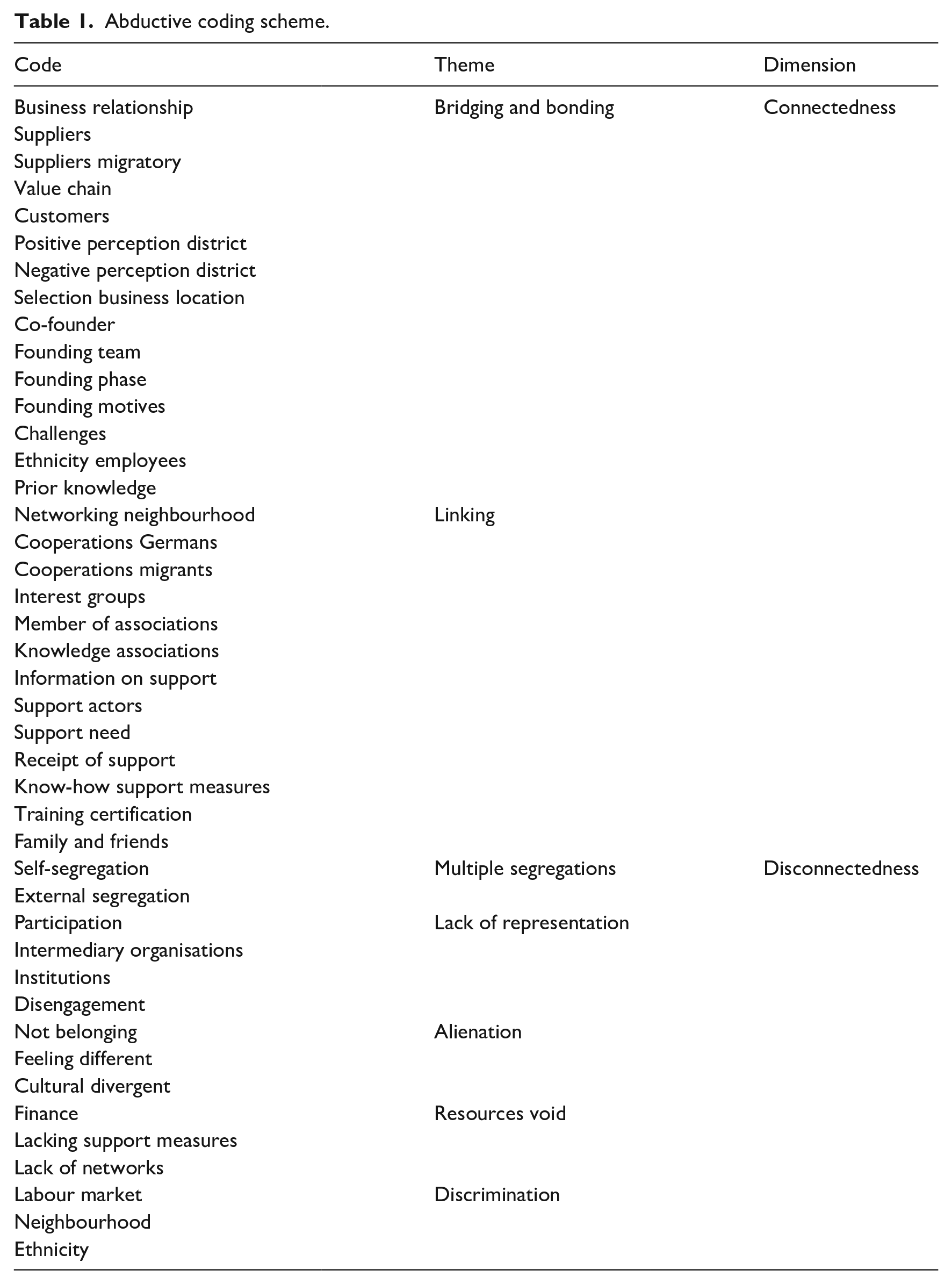 Abductive analysis indicates that contrary to initial expectations, there is a greater prevalence of disconnectedness than connectedness among the interviewed MEs and the EE. Specifically, the study revealed a general scarcity of formal collaboration networks among MEs, varying interconnectedness with German entrepreneurs, and language barriers significantly influencing partnerships. While some value chain relationships thrived, institutional support often fell short for smaller businesses. Many entrepreneurs expressed feelings of social detachment, citing segregation, discrimination, a feeling of estrangement and limited resource access. These findings align with the literature highlighting limited resource access for MEs due to cultural differences (Bolzani and Mizzau, 2020; Neumeyer et al., 2019), although this aspect of connectedness remains underexplored. This understanding of the migrant entrepreneur’s connectedness and disconnection in EEs draws from Granovetter’s foundational work (1985, 2000) in social capital economics, complemented by contributions from Coleman (1988), Burt (2001) and Portes (2000). Concepts such as bonding, bridging, structural holes, network closers and linking of social capital originate from these elaborations (Adler and Kwon, 2002; Claridge, 2018).