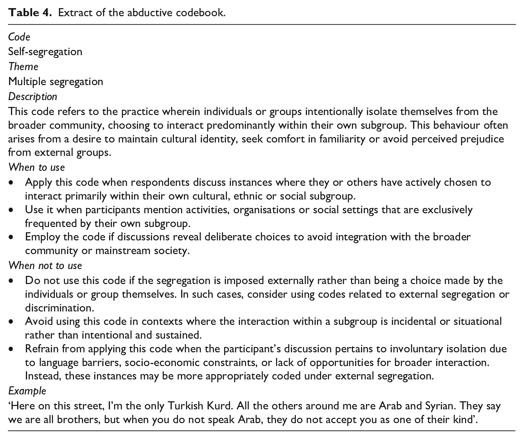 As depicted in Table 3, the authors initiated the data analysis process by transcribing and thoroughly familiarising themselves with the data as the preliminary step. Subsequently, they engaged in abductive coding, beginning with identifying themes informed by the theoretically derived interview guidelines, facilitating the creation of a deductive codebook (Step 2a; see Table 4).