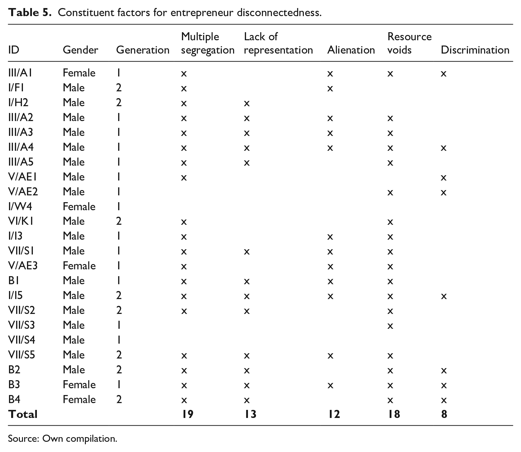 On this note, the key contribution of this study is challenging the prevailing view that EEs are universally supportive of all entrepreneurial agents. By highlighting the pervasive issue of disconnectedness faced by marginalised groups, particularly MEs, this study emphasises the necessity of critically examining how disconnectedness affects these groups (Azmat, 2013). In so doing, it advances existing knowledge by demonstrating that MEs frequently encounter persistent disconnectedness, which significantly impedes their ability to access opportunities and resources (Bolzani and Mizzau, 2020; Neumeyer et al., 2019). Only simultaneously considering both connectedness and disconnectedness provides the complete picture of MEs within EEs. While the research question initially points to the role of resources, opportunities and support networks, the results, in line with prior findings (Lassalle et al., 2020; Williams and Krasniqi, 2018), reveal the importance of these factors. However, the empirical data extend beyond these and crystallises five constituent factors: (1) multiple segregations, (2) lack of representation, (3) alienation due to cultural divergence, (4) resource voids, and (5) discrimination. As shown below, the findings allow us to take the first steps to carve out the profile of the identified factors.