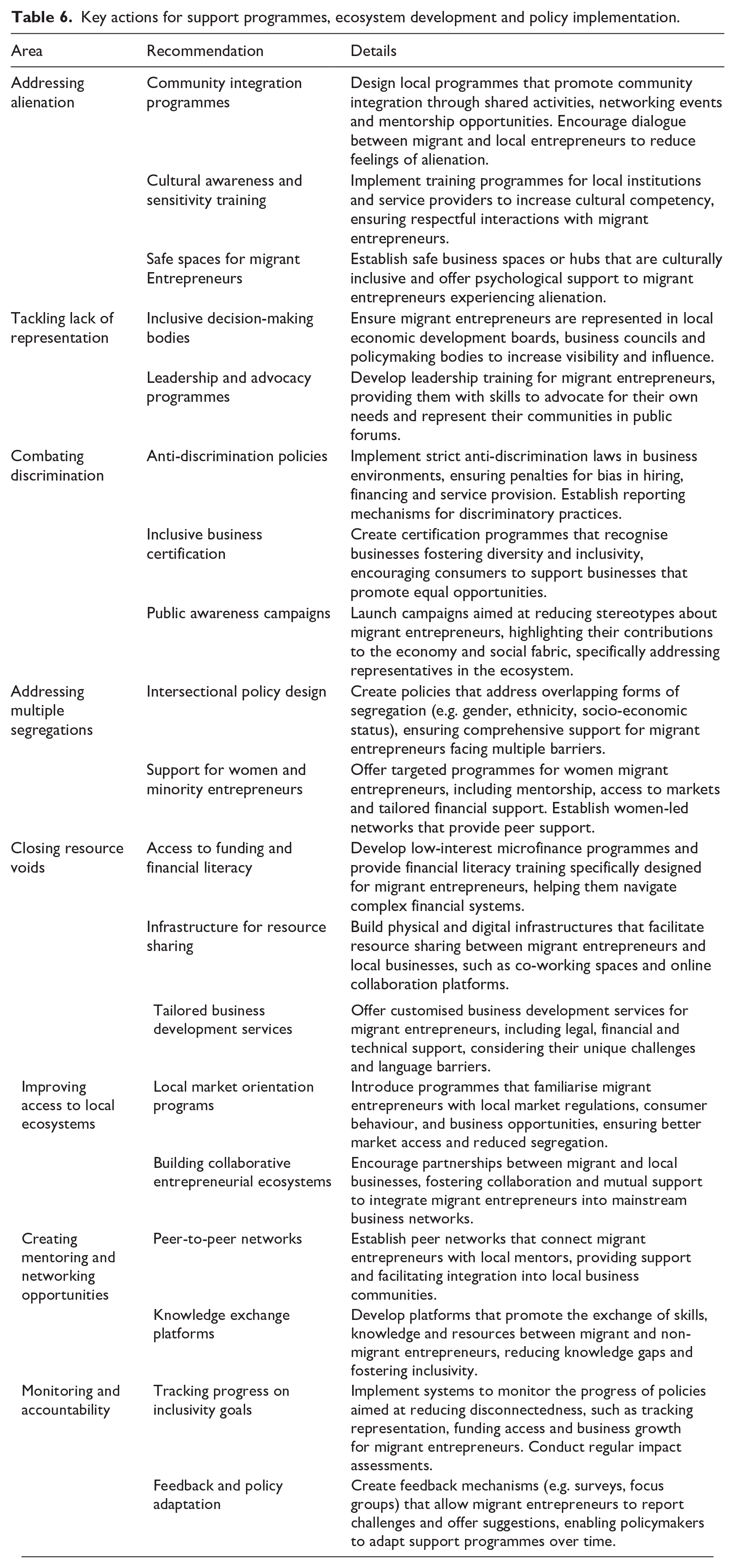 The contribution of MEs to EEs, however, is not independent of the EEs themselves: EEs have the potential to play a pivotal role in supporting the integration of MEs (David and Terstriep, 2024). Inclusive and well-resourced ecosystems can provide critical support structures such as micro-financing, legal consultancy and networking opportunities, helping MEs overcome barriers to entry and growth (Lassalle et al., 2020; Williams and Krasniqi, 2018). Access to incubators, accelerators and mentoring programmes specifically tailored to the needs of MEs can also facilitate successful integration by providing the necessary tools, knowledge and connections (David and Terstriep, 2023). Policymakers should focus on reducing regulatory barriers, while incubators can design culturally tailored mentorship programmes. Local governments play a role by fostering community-driven initiatives that promote migrant-led innovation hubs. While support programmes offer significant advantages, including resource access and fostering innovation, their effectiveness for MEs is often limited by a lack of tailored services, short-term focus, network exclusion and fragmentation, as well as lacking acknowledgement of diversity among migrant entrepreneurs (Solano et al., 2022a). Addressing these challenges is crucial for ensuring these programmes support the long-term success of migrant-led ventures within the broader entrepreneurial ecosystem.