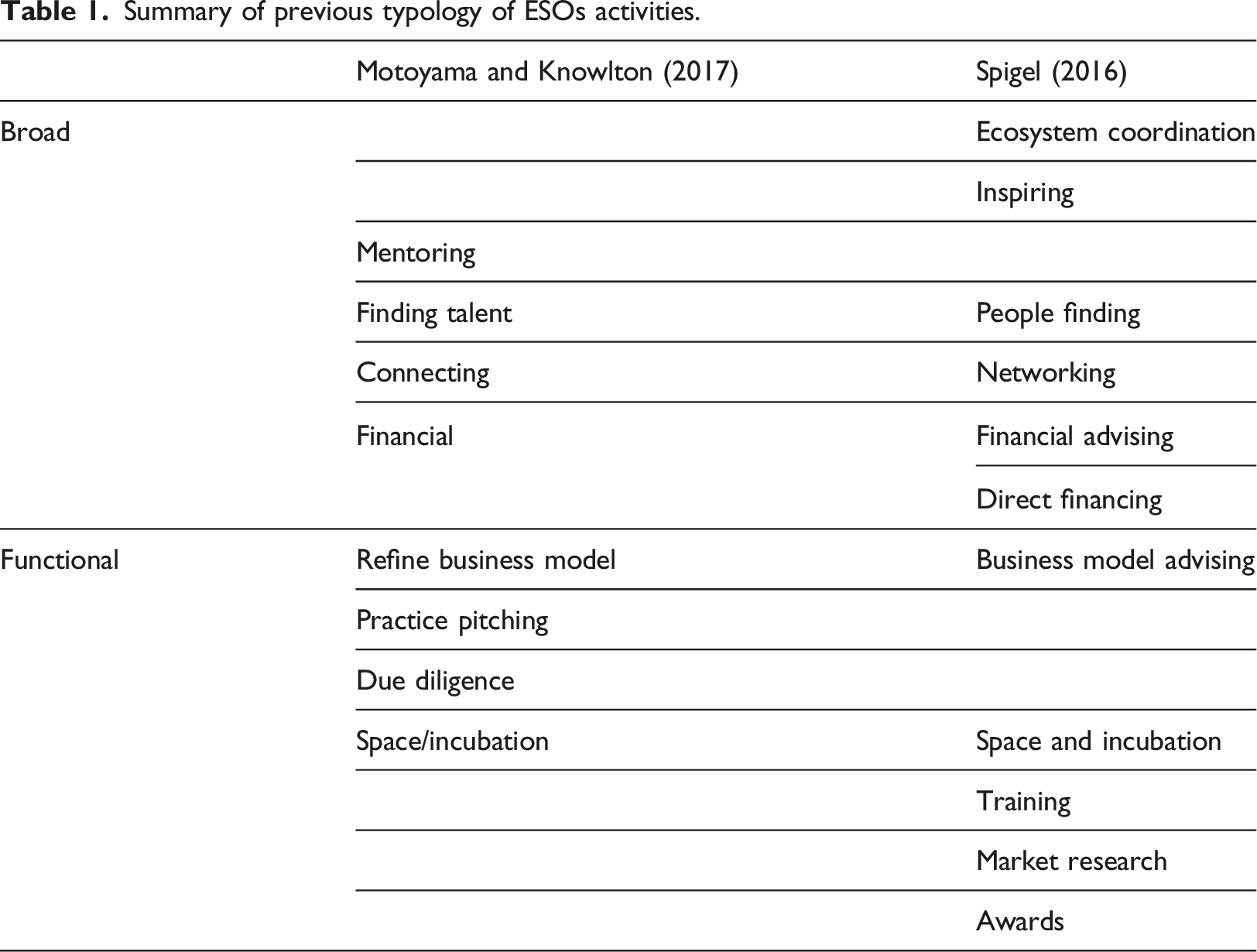 Nevertheless, these studies do not arrive at a clear-cut definition of ESOs, possibly due to the ambiguity of the phenomenon (Bergman and McMullen, 2022). Also, they are narrow in scope: one study focuses on a small cohort of start-ups that engaged with one ESO (Motoyama and Knowlton, 2017); the other focuses exclusively on tech ESOs (Spigel, 2016). Thus, the typologies of ESOs activities developed in these papers are incomplete, as illustrated by the gaps in Table 1. Moreover, entrepreneurial ecosystems are systemic and typically sector-agnostic phenomena which means that in order to understand their constituent elements, such as ESOs, it is important not to limit the scope of inquiry to a particular type of ESOs or sector. In this paper, we overcome the limitations of previous studies by investigating ESOs and their role in supporting entrepreneurial activity at the (eco)systemic level across all sectors. However, given our earlier point about the importance of ESOs coherence for the effective functioning of ecosystems, we need to first introduce the concepts of institutional and organisational thickness, which we later use as the analytical framework to analyse the ESOs landscape.