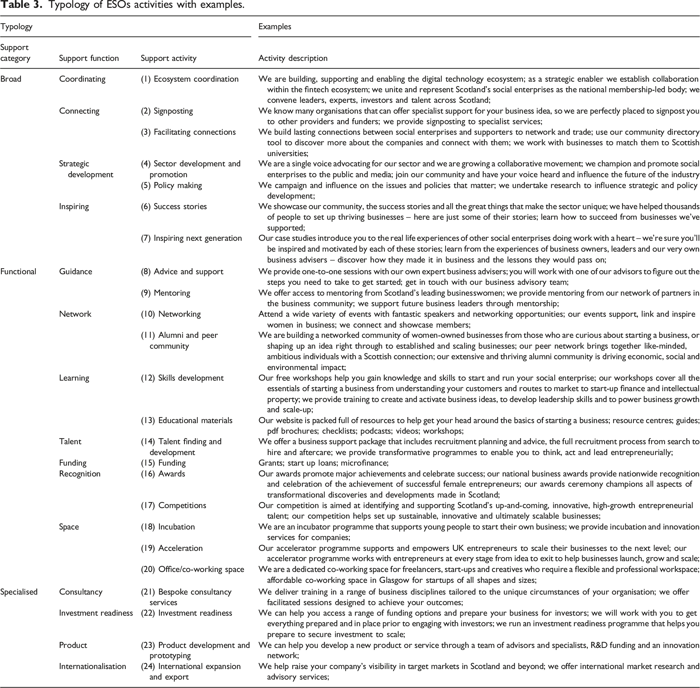 At the beginning of data collection, ESOs were identified via an online search, the Scotland Can Do Directory, 4 and the Scottish Entrepreneurial Ecosystem Guide. 5 We then drew on a range of online data, which is an increasingly popular approach in ecosystem research (Spigel et al., 2020: 9). Our primary source of data were websites but also occasionally brochures and annual reports that described the background and activities of each ESO in detail. Whilst this approach has limitations due to the self-reported nature of the documents, a key benefit is that it reflects the authentic practice of entrepreneurs, who are likely to search for support in the same way.