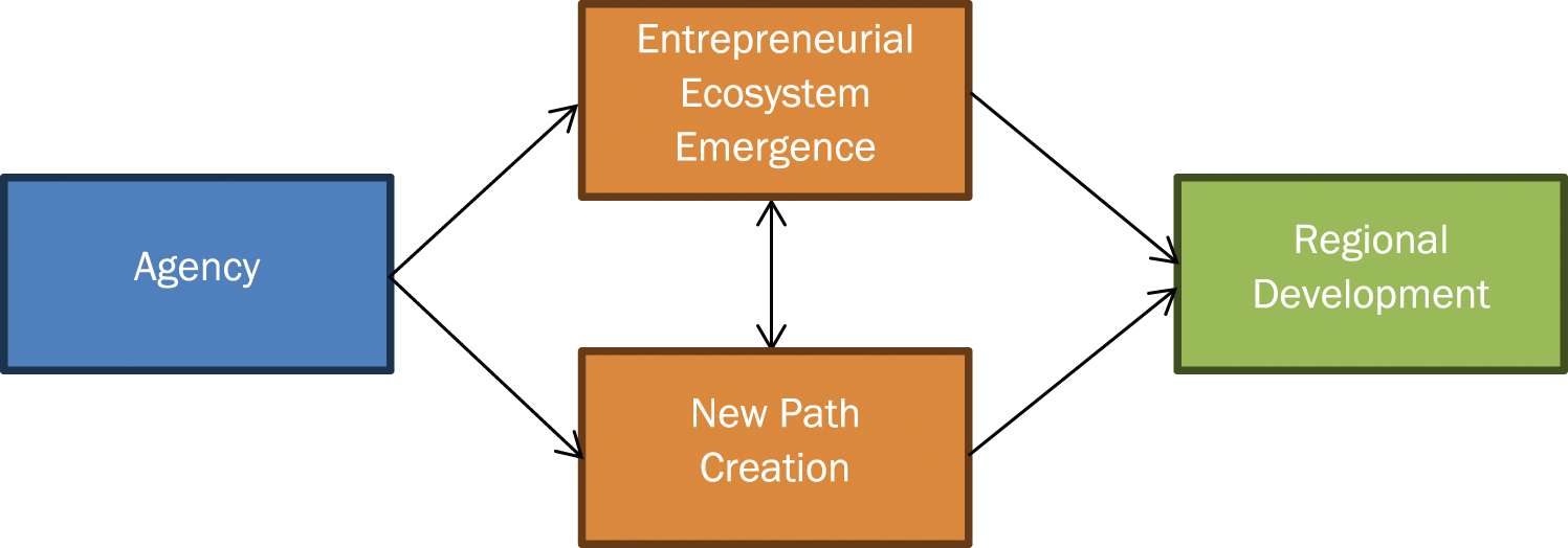 Furthermore, from the perspective of new path creation a fundamental issue concerns the role of agency in relation to the emergence of entrepreneurial ecosystems as a catalyst of new development paths (Bristow and Healy, 2014; Huggins and Thompson, 2023). In particular, given the focus on the role of individuals within ecosystems it is important to consider different forms of human agency related to regional development facilitated by new path creation and entrepreneurial ecosystem emergence.