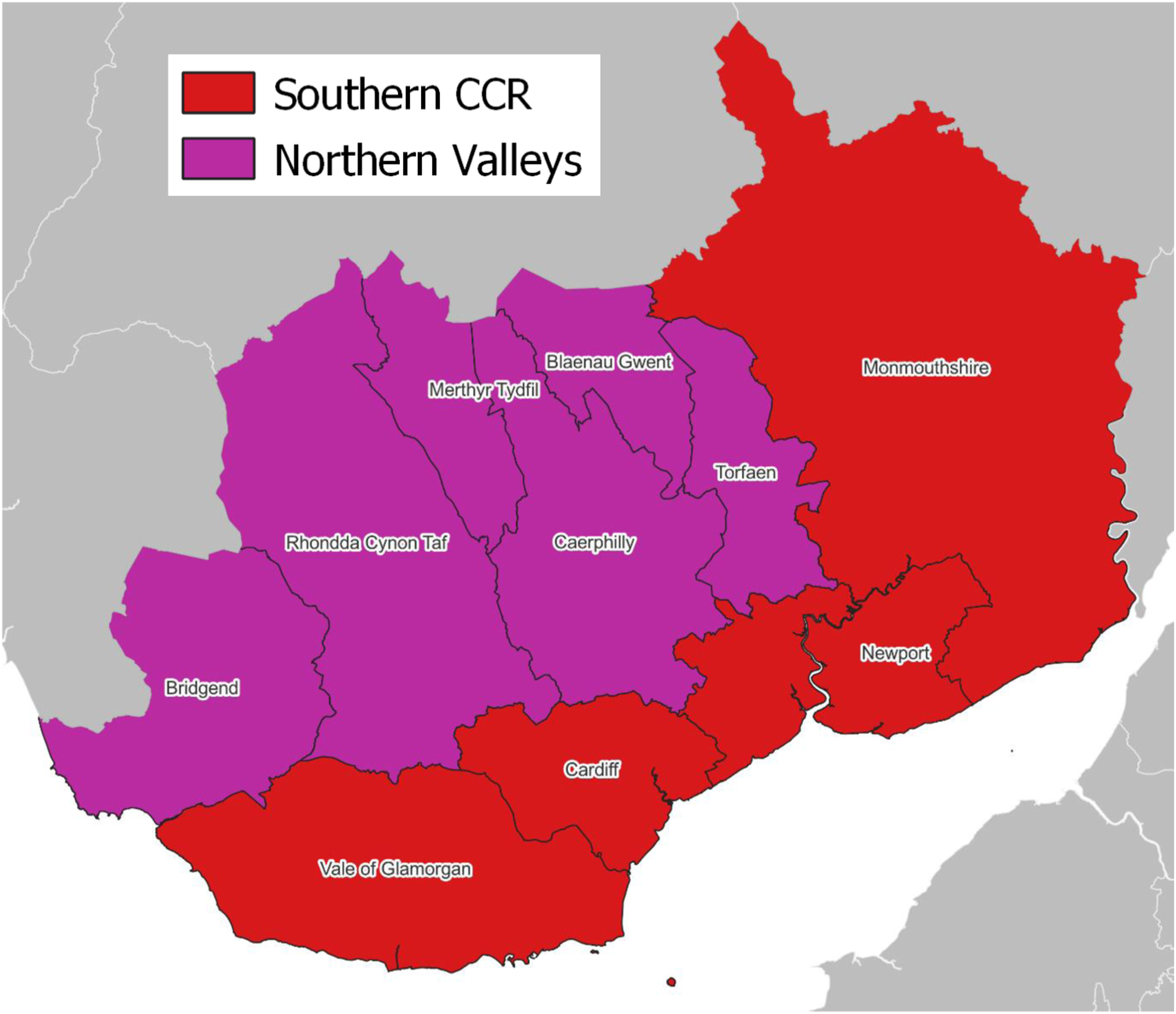 The Cardiff city region is an economically lagging area of the UK situated within the devolved wider nation of Wales. It is formed of 10 local authority areas covering Cardiff, the main urban centre, and a number of other areas that largely form the traditional mining and post-industrial parts of Wales. The city region can effectively be split into two sub-regions as depicted in Figure 2. The first of these is the Southern portion of the city region, which consists of those local authorities in close proximity to Cardiff and connected by the key M4 motorway corridor. The second group is the Northern Valleys which has historical connections to the mining, iron and steel industries and generally weaker transport connections (Shirani et al., 2021). Map of Cardiff city region (Cardiff Capital Region [CCR]).