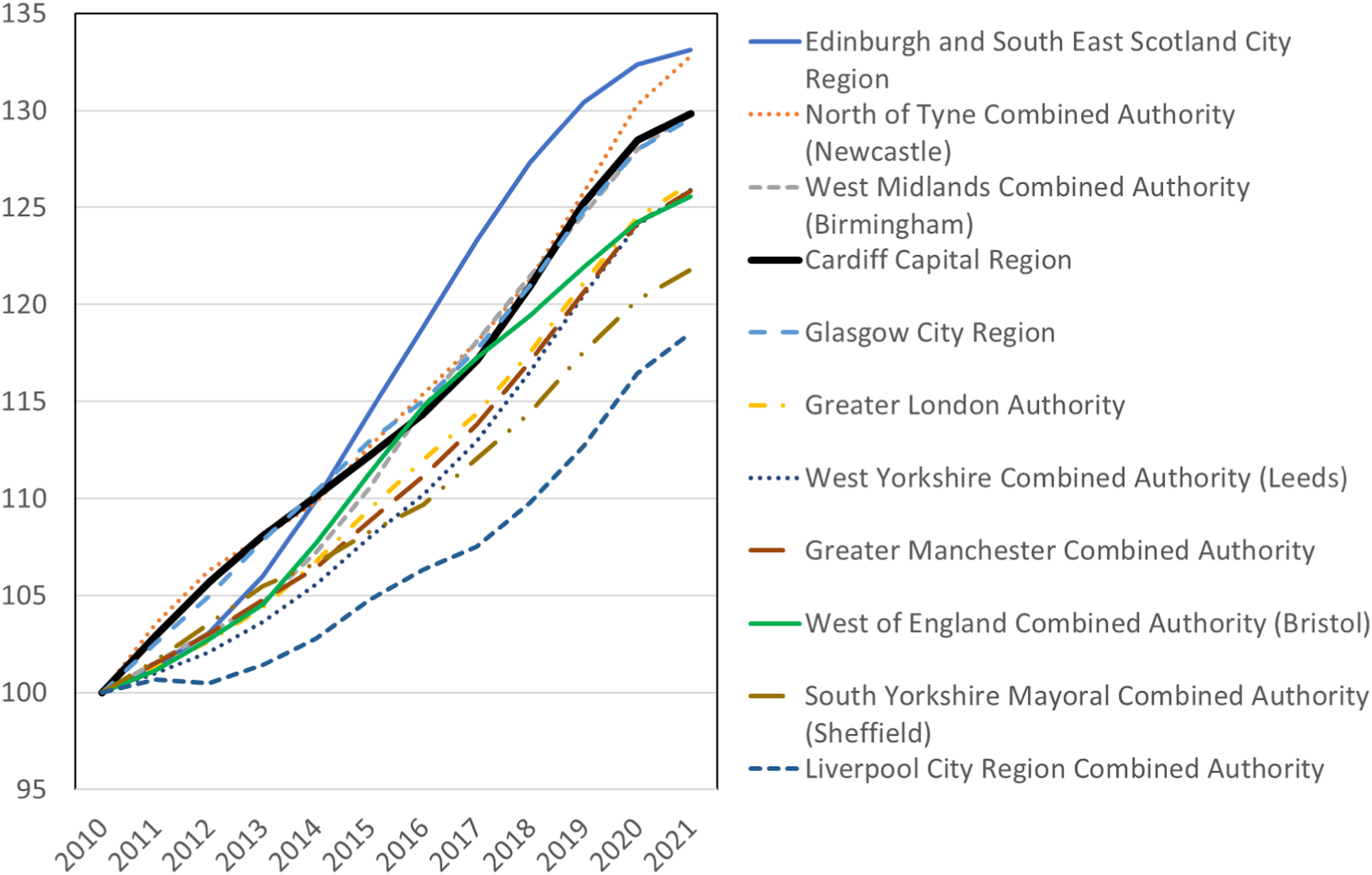 The city region has a population of approximately 1.5 million people accounting for approximately 50% of the population of Wales as a whole and similarly approximately 50% of the total economic output of Wales. The underperformance of the Welsh economy has been embedded for many years, and it has significantly low gross value added (GVA) per capita levels compared with the UK average. As a result of industrial restructuring, whereby traditional manufacturing jobs were replaced by low value service jobs (Beatty, 2016), GVA per job (labour productivity) and wage employment are also below the UK average (Huggins et al., 2018). The city region has suffered from higher levels of unemployment, and a large proportion of this is hidden as incapacity benefits (Beatty and Fothergill, 2023).