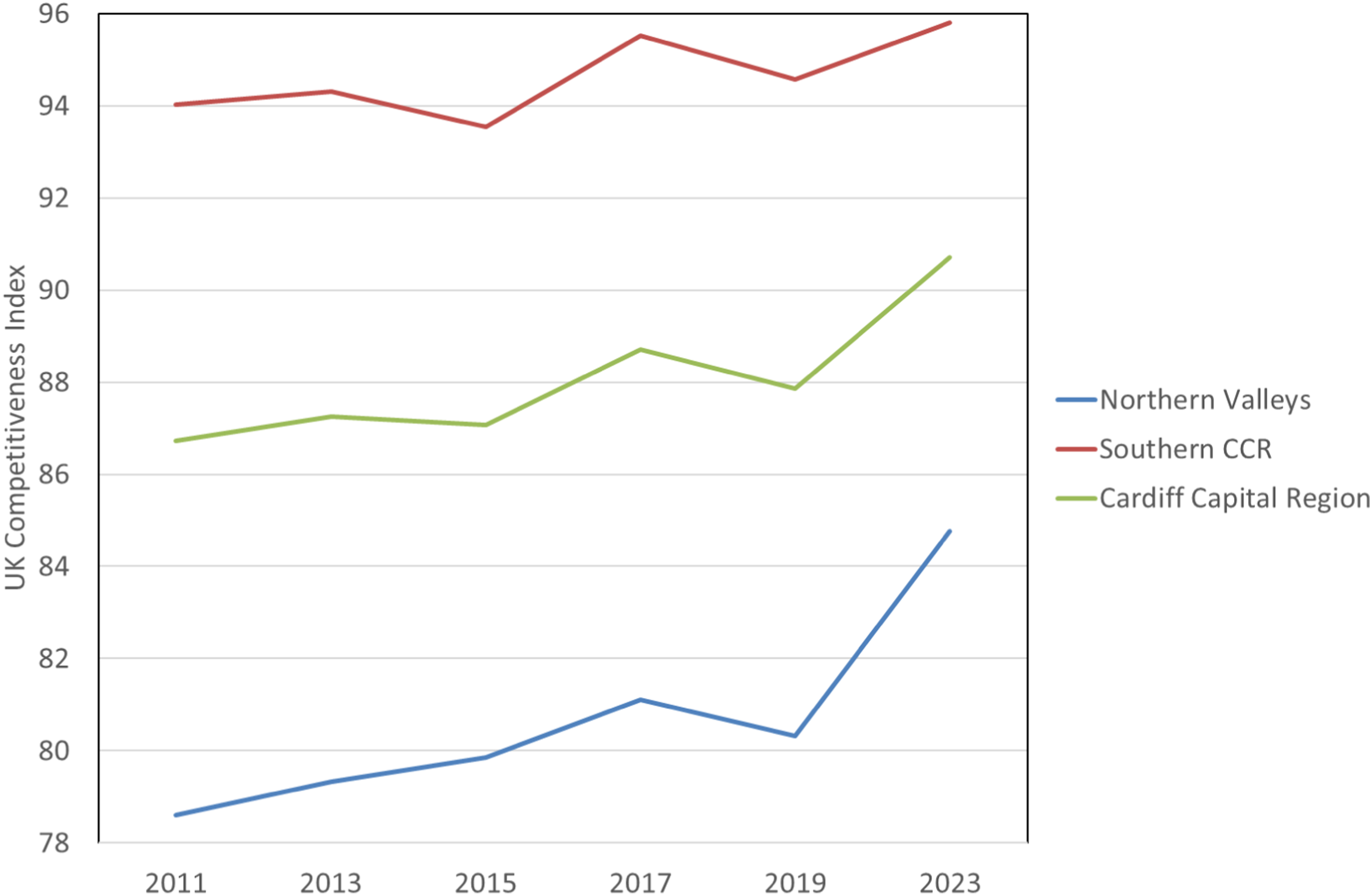 As well as the growth in high-tech enterprises, there are a number of other positive indicators. For example, an independent survey of cities across the UK found that Cardiff was the most improved city between 2017 and 2020 for ‘good growth’, which is a composite measure of performance covering the availability of opportunity and levels of prosperity and well-being (PwC, 2022). Also, data for 2021 indicated that it was a record year for equity investment for small firms, with Cardiff being ranked the 10th highest equity investment hub in the UK, with the software sector having the largest number of deals (British Business Bank, 2022). Measures of productivity per hour worked also highlight how these new development paths have positioned the city region as one of the most improved after 2010 (Figure 3). Among the city regions that host the larger cities of Great Britain, only Edinburgh and Newcastle have seen a markedly stronger relative improvement than the Cardiff city region between 2010 and 2021. Finally, the UK Competitiveness Index (UKCI), shown in Figure 4, suggests that much of the improvement relative to the UK over the period 2010 to 2023 is attributable to the growing performance of the Northern Valleys of the city region (Huggins et al., 2023). Productivity (gross value added per hour worked) for city region areas with larger cities in Great Britain. Source: ONS Subregional Productivity June 2023 (ONS, 2023). UK Competitiveness Index (UKCI) for the Cardiff city region. Notes: UK average UKCI = 100; UKCI values for 2011–2019 utilise drawn from the year they represent, the 2023 uses the latest available data. Source: Huggins et al. (2023).