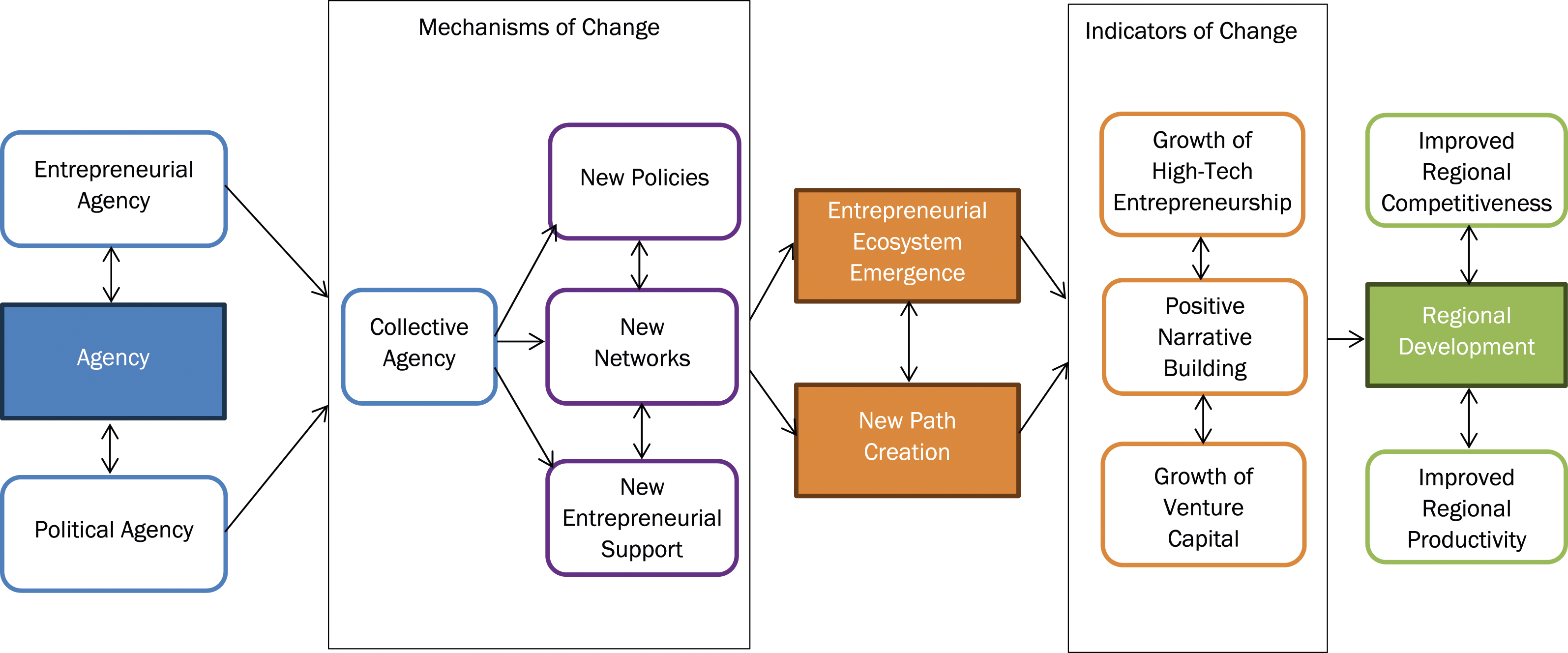 As this study has shown, the actual number of entrepreneurs initially involved can be quite limited as long as they possess the necessary agency to effectively form new networks and engage with local political agents. Indeed, perhaps the most critical part of entrepreneurial ecosystem emergence in weak regions will be the capability and capacity for entrepreneurial and political agents to interact in a meaningful manner. It is this understanding and awareness that allow the formation of a collective agency whereby an intersection of common goals and visions emerges. This collective agency begins to extend beyond the initial entrepreneurs and policymakers to a wider community of agents consisting of additional entrepreneurs, firms, financiers, universities and others that create the networks underpinning the emergence of an ecosystem.
