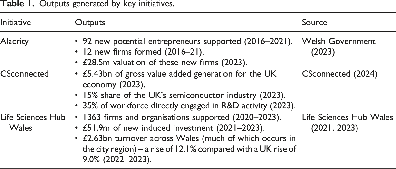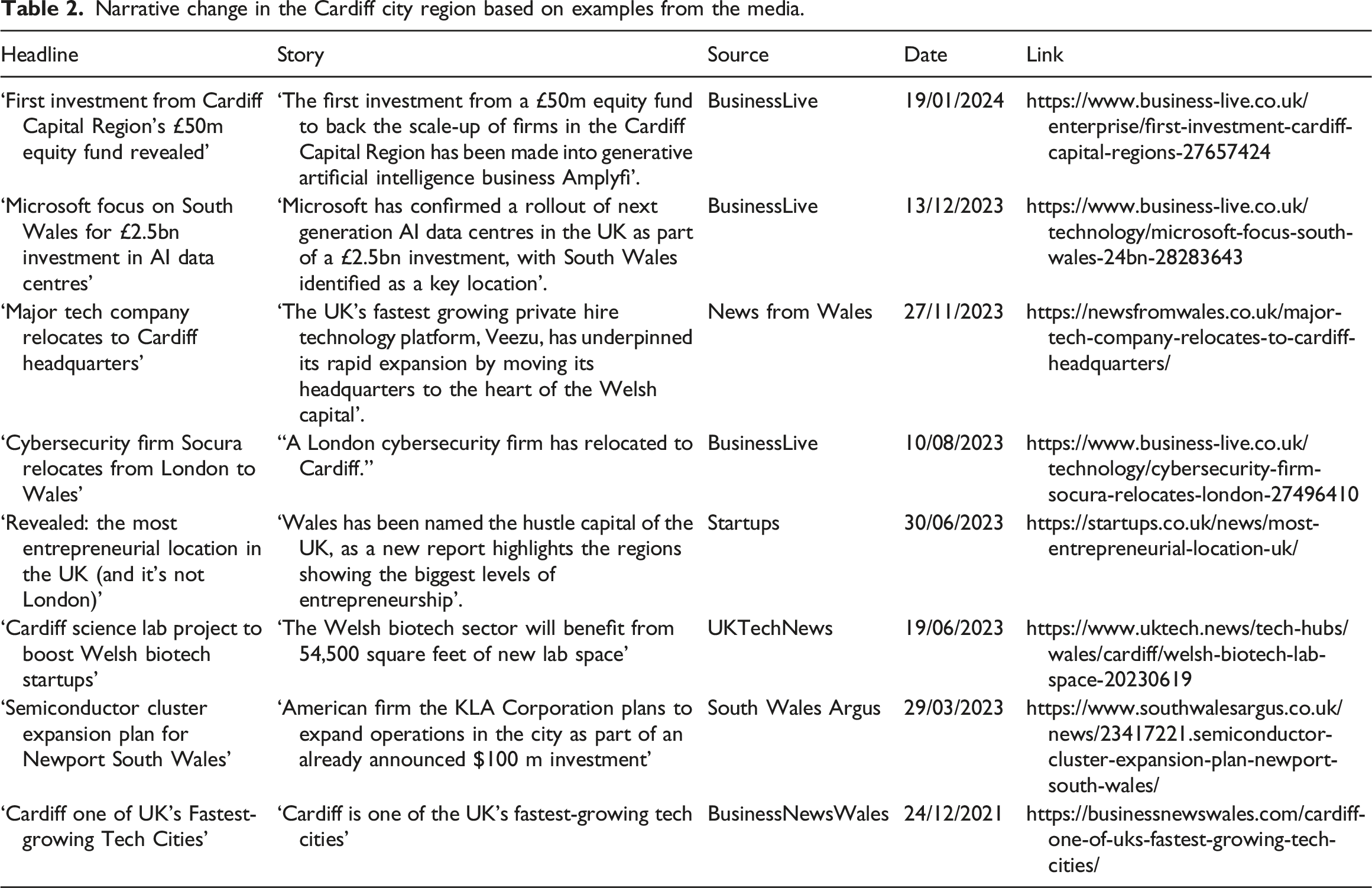 The methodological approach adopted is to take the Cardiff city region as a case study to examine the emergence of a high-technology entrepreneurial ecosystem. The main methodological approach consisted of a series of interviews with key informants across the city region. In total, 27 interviews were undertaken with 24 interviewees (3 interviewees were interviewed twice with the second interviews providing further information relating to developments in the city region). Of the 24 interviewes, 13 represented members of the city region’s high-technology industry and were either the founders and/or the directors of their enterprise. These enterprises formed a mix of small, medium and large businesses and covered the following industries: microelectronics, healthcare, digital technologies, renewable energy and financial technology. A further six interviews represented the city region’s policy community with a responsibility for policy formulation, which consisted of senior public sector representatives as well as representatives from the local business community that were engaged in policy formulation. Finally, three interviews represented local academia and two from the finance community.