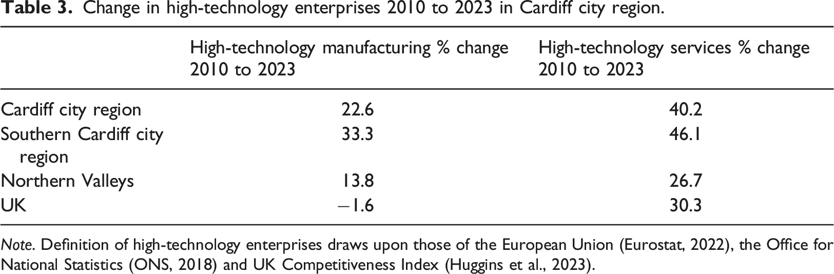 The interviews were undertaken through a mix of in-person interviews and telephone/online (usually using Zoom software). Although there is a mix of media for the interviews, it is generally considered that online interviews provide an environment to collect data of the same quality to that administered in-person (Salmons, 2015). These interviewees were identified through the research teams’ own knowledge of members of relevant business and policy community, as well as through lists published by the local media of high-technology businesses operating in the region. Interviews lasted on average approximately 1 hour and detailed notes were taken for each.
