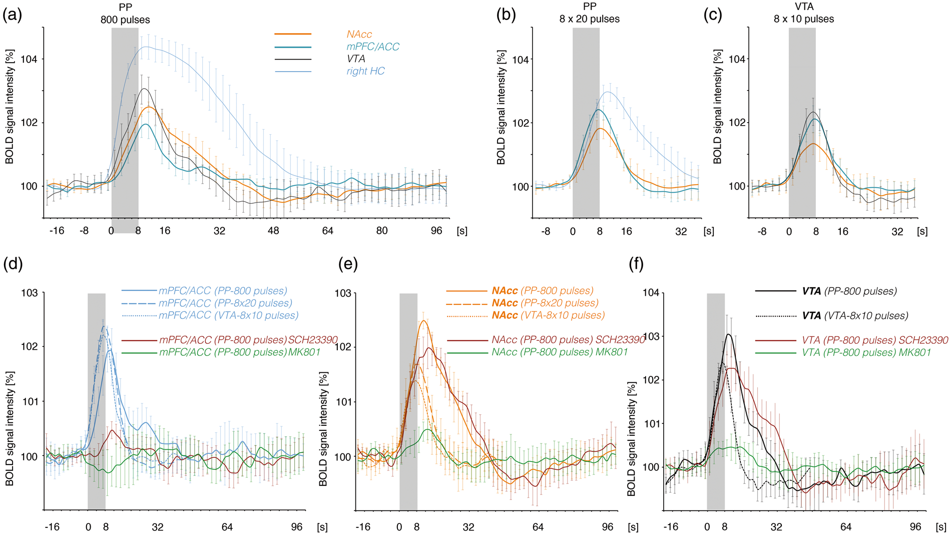 Summary of the observed BOLD responses during the applied stimulation protocols. The hemodynamic response functions (HRF), characterizing the BOLD response, are compared. (a) Electrical stimulation of the perforant pathway with continuous 100 Hz pulses for 8 s triggered BOLD responses in various regions of the rat brain. During this stimulation condition the maximal BOLD response in the NAcc (orange line) exceeded the maximal BOLD response in the mPFC/ACC (blue line). (b) Electrical stimulation of the perforant pathway with bursts of high-intensity pulses also triggered BOLD responses in various regions of the brain. Under this stimulation condition the BOLD response in the mPFC/ACC (blue line) exceeded the response in the NAcc (orange line). (c) Electrical stimulation of the VTA also triggered BOLD responses in various regions. Again the BOLD response in the mPFC/ACC (blue line) exceeded the response in the NAcc (orange line). (d) Comparison of the HRFs in the mPFC/ACC during all stimulation conditions. Whereas the initial slope of the HRF was similar during electrical VTA (dotted line) and high-intensity burst pulse stimulations of perforant pathway (dashed line), the initial slope was delayed during low-intensity continuously pulse stimulation (solid line). For comparison, the effects of SCH23390 (red solid line) and MK801 (green solid line) on the BOLD response during continuous 100 Hz pulse stimulations are included. (e) The initial slope of the HRF in the NAcc was similar during all stimulation conditions. The presence of MK801 almost abolished the formation of a BOLD response in the NAcc during continuous 100 Hz pulse stimulation. (f) The initial slope of the HRF observed in the VTA/SN region during electrical stimulation of the VTA (dotted line) and during electrical stimulation of perforant pathway with continuous 100 Hz pulses was identical. Again, the presence of MK801 inhibited the BOLD response in the VTA/SN region.