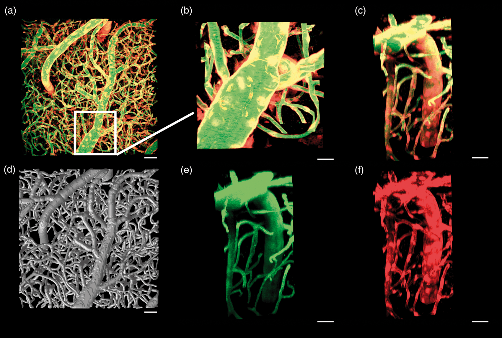 Maximum intensity projection normal to the cortical surface and centered over the primary motor cortex of a Cre x tdTomato mouse with vascular endothelial cells expressing tdTomato (red) and Oregon green dextran distributed within plasma (green) (a, scale 50 µm). The vessel-tracked vascular tree for this data set is seen in (d), scale 50 µm. Insets are of a penetrating vessel from the top (b, scale 20 µm) and the side showing the composite (c, scale 30 µm), green only (e, scale 30 µm), and red only (f, scale 30 µm) channel data.