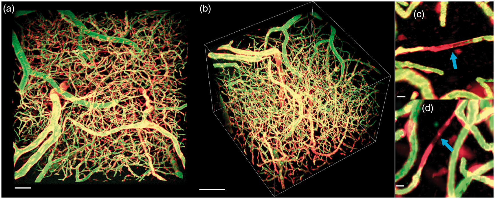Maximum intensity projection of a two-photon fluorescence microscopy z-stack from the surface of the motor cortex (a, scale 50 µm) and side angle (b, scale 100 µm) with red showing vascular endothelial cells expressing tdTomato and green showing intravascular Oregon green. (c) and (d) (scale 10 µm) shows tdTomato labeling in the absence of Oregon green labeling (blue arrows), suggesting a new vessel.