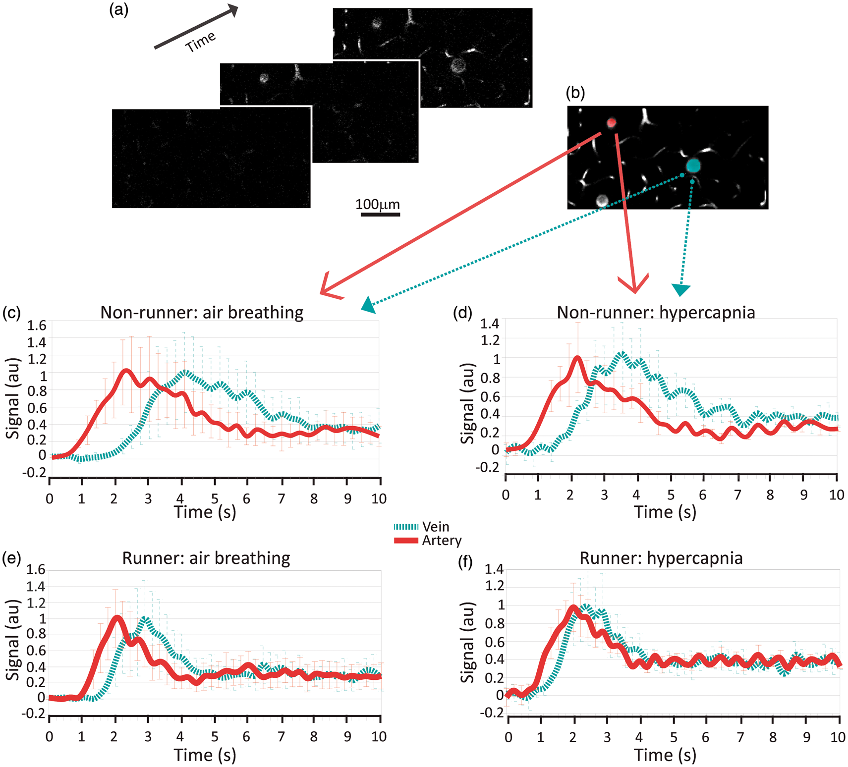 To examine functional changes in cerebral vasculature induced by voluntary exercise, we followed the passage of a fluorescent dextran bolus through the microvascular bed at 125–150 µm beneath the cortical surface in 11 nonrunners and 11 runners. The signal peaked first in the artery, then in capillaries, and lastly in the veins (Figure 3(a) and (b) showing the signal time traces in a sample artery and a sample vein). Inhalation of 10% CO2 induces a drop in pH and a robust cerebral (and peripheral) vasodilation and blood flow increase. Figure 3(c) and (d) shows signal traces in an example artery and vein from a nonrunner during air breathing (c) and during hypercapnia (d), showing the quickening of bolus transit through both vessels in response to hypercapnia. Similar changes are qualitatively observed in signal traces of an example artery and vein of a runner mouse, in Figure 3(e) (air breathing) and (f) (hypercapnia), but with an attenuated CO2 induced shortening of arterial transit time. Due to the small lateral FOV and limited light penetration depth relative to the extent of mouse cortical cerebrovascular network, it is frequently not possible to ascertain whether a given pair of vessels are closely connected, precluding assessment of the effects of the vessel’s branching order on the transit time.