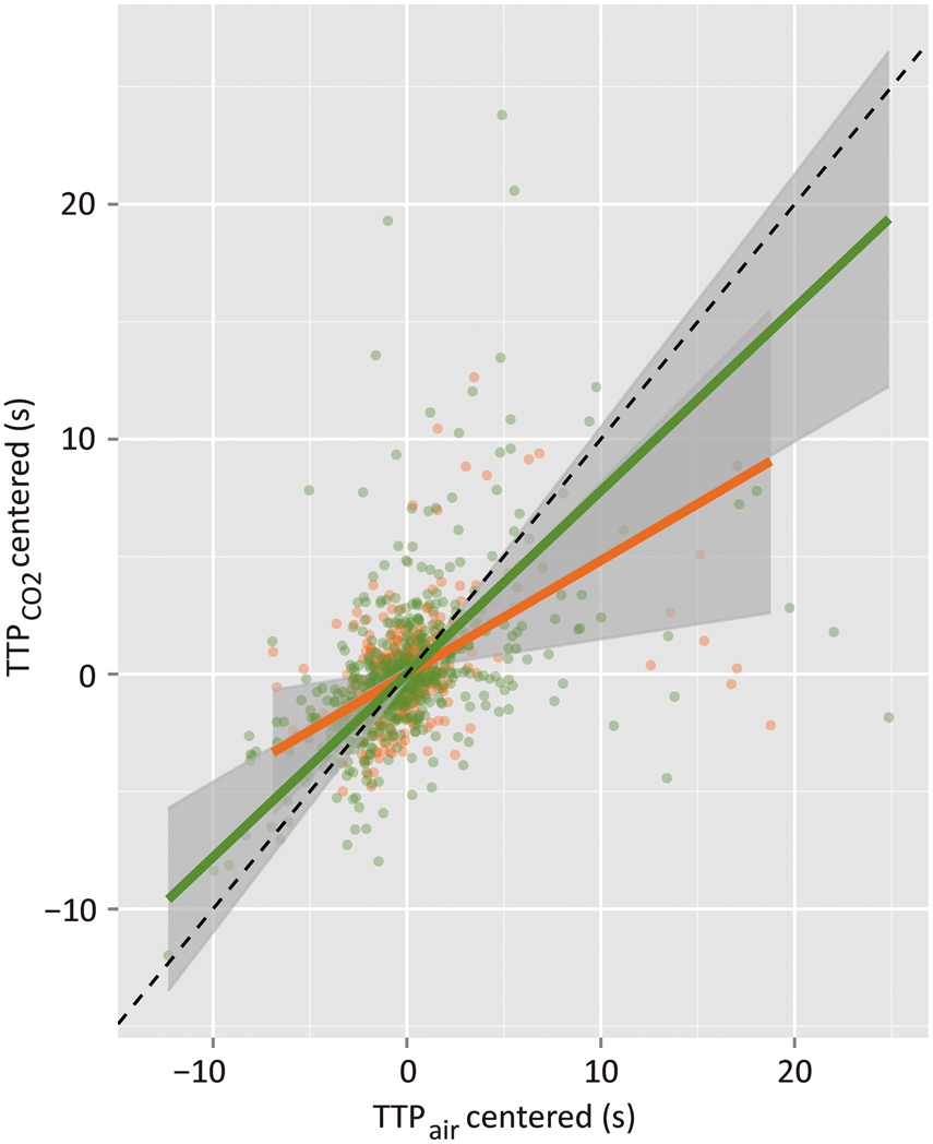 Flow was estimated by inverse slope of Deming regression to hypercapnic versus normocapnic TTP data across all vessels (since no vessel-type effects were found), as shown in Figure 4. (Deming regression