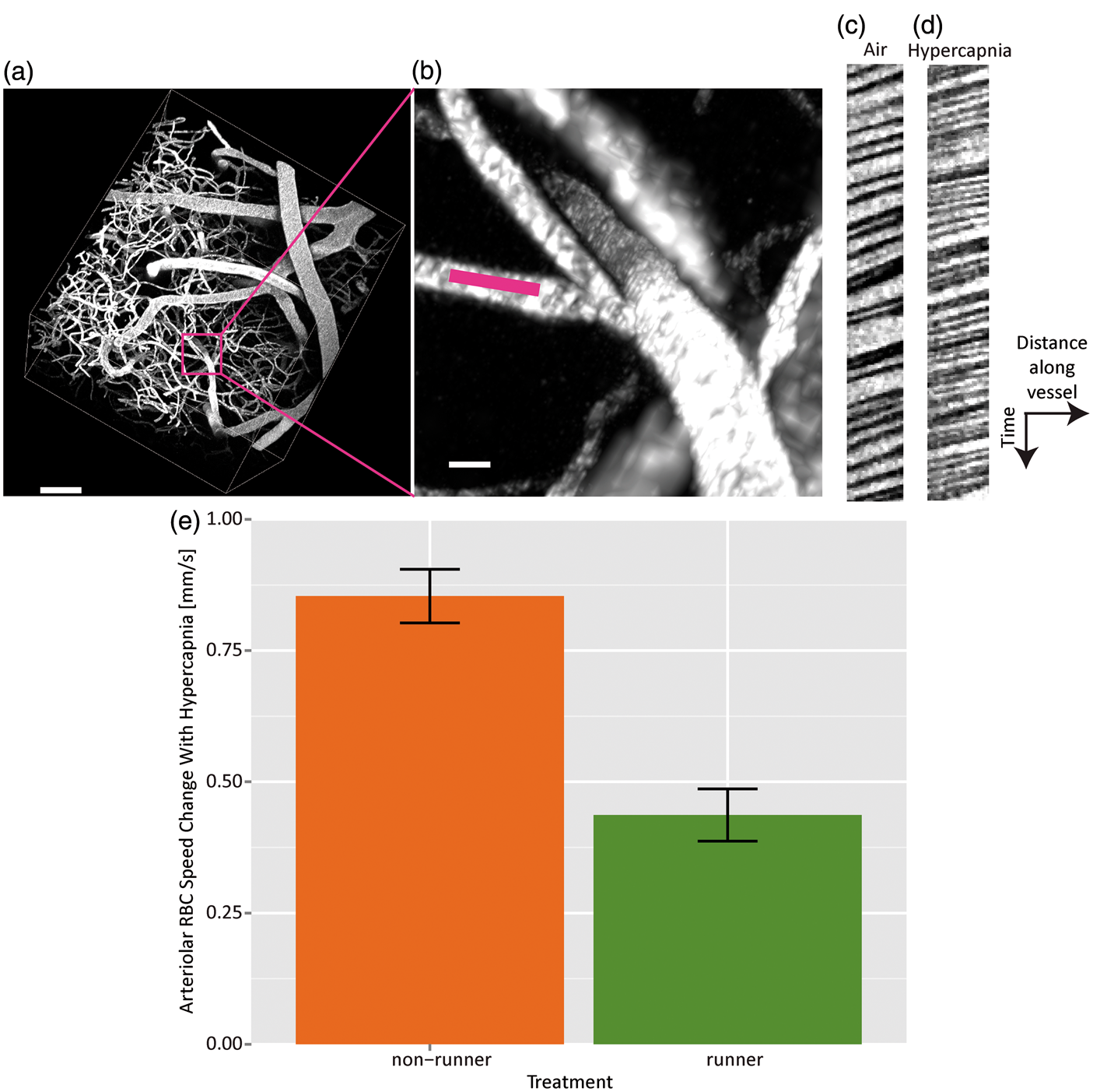 RBC speeds are measured in a penetrating vessel branch of an artery (a, scale 80 µm, and b, scale 10 µm, with pink line showing location of line scan). Line scan data samples from this vessel during air (c) and hypercapnia (d). RBC speeds thus estimated in this vessel were 1.32 ± 0.02 mm/s during air breathing and 1.86 ± 0.03 mm/s during breathing of 10% CO2. Steeper slopes indicate smaller RBC speeds. Bar graph (e) showing change in arteriolar RBC speed induced by hypercapnia for nonrunners (N = 5) and runners (N = 4).