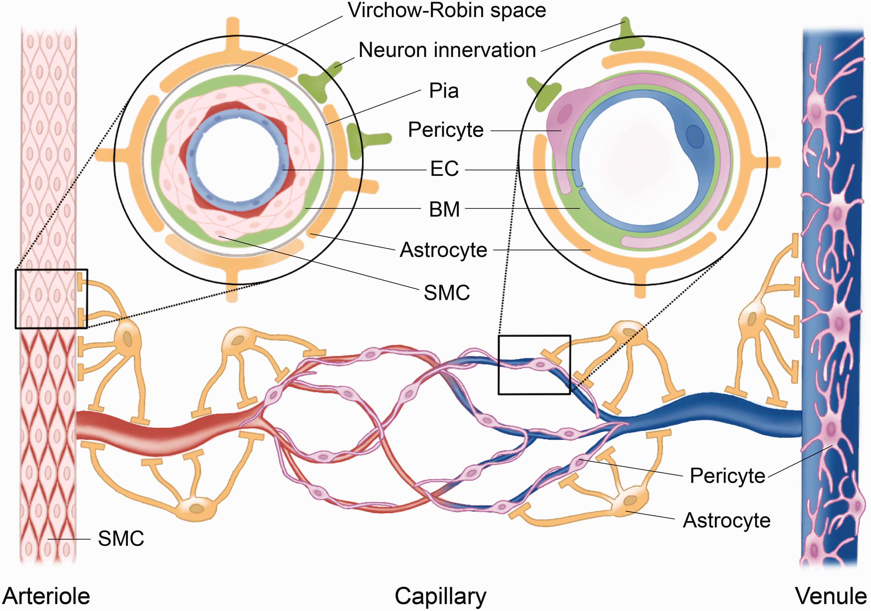 The typical components of the neurovascular unit (NVU) in the central nervous system (CNS). The NVU comprises (1) vascular cells, including endothelial cells (ECs) and mural cells, such as pericytes on capillaries and venules, or smooth muscle cells (SMCs) on arterioles and small arteries; (2) neuroglial cells, such as astrocytes; and (3) neurons. ECs form the luminal layer of the vessel wall. The space between adjacent ECs is held by paracellular junctions. The expression of some junctional proteins (including claudin-11, ZO-1, occludin, catenin, and VE-cadherin) is lower in the BSCB than in the BBB. At the arteriolar level (left inset), the basement membrane (BM) and SMC envelope endothelium. Astrocytic endfeet insert into the BM to regulate SMCs through the pia and the glia limitans. The capillary and venule (right inset) lack SMCs, where pericytes embed in the BM and wrap around the ECs on the abluminal side. The astrocytic endfeet attach to the pericytes at both venules and capillaries. Pericyte coverage is less on the BSCB than on the BBB. SMCs, pericytes, and astrocytes all receive neuronal innervation to control their function. In addition, these conformations of cells are also the major cellular structure of the blood–central nervous system barrier.