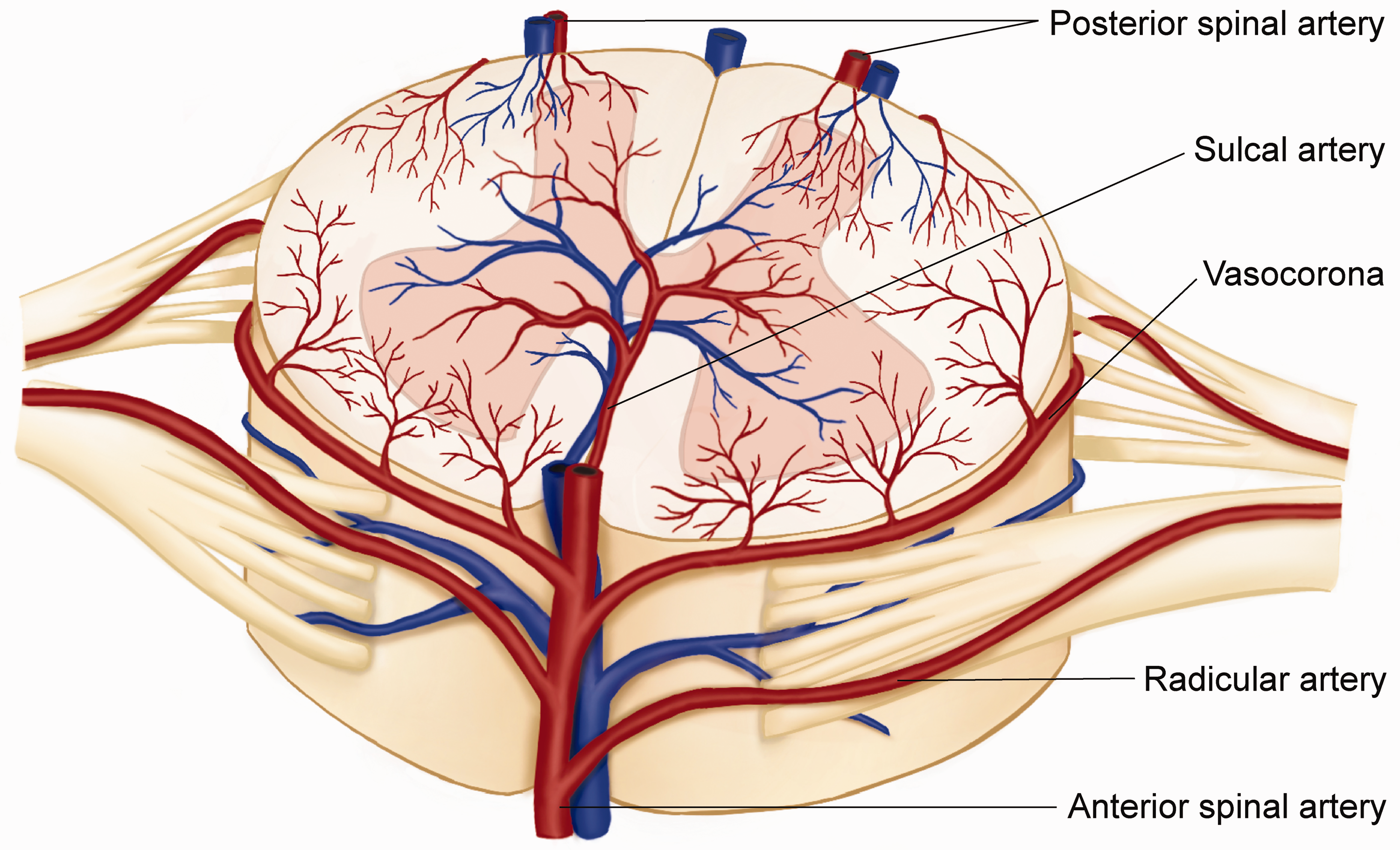 In humans, the parenchyma of the spinal cord is supplied by branches of several major arteries, including the vertebral and posterior-cerebellar arteries. The anterior radicular artery enters the spinal cord bilaterally, with each anterior root joining the anterior spinal artery, which descends on the ventral surface of the spinal cord. Small branches of the vertebral or posterior-inferior cerebellar arteries continue caudally over the dorsal spinal cord, usually forming two small trunks known as the posterior spinal arteries (Figure 2). While the venous drainage of the spinal cord may be variable, its anatomic pattern often runs parallel to the paired artery.