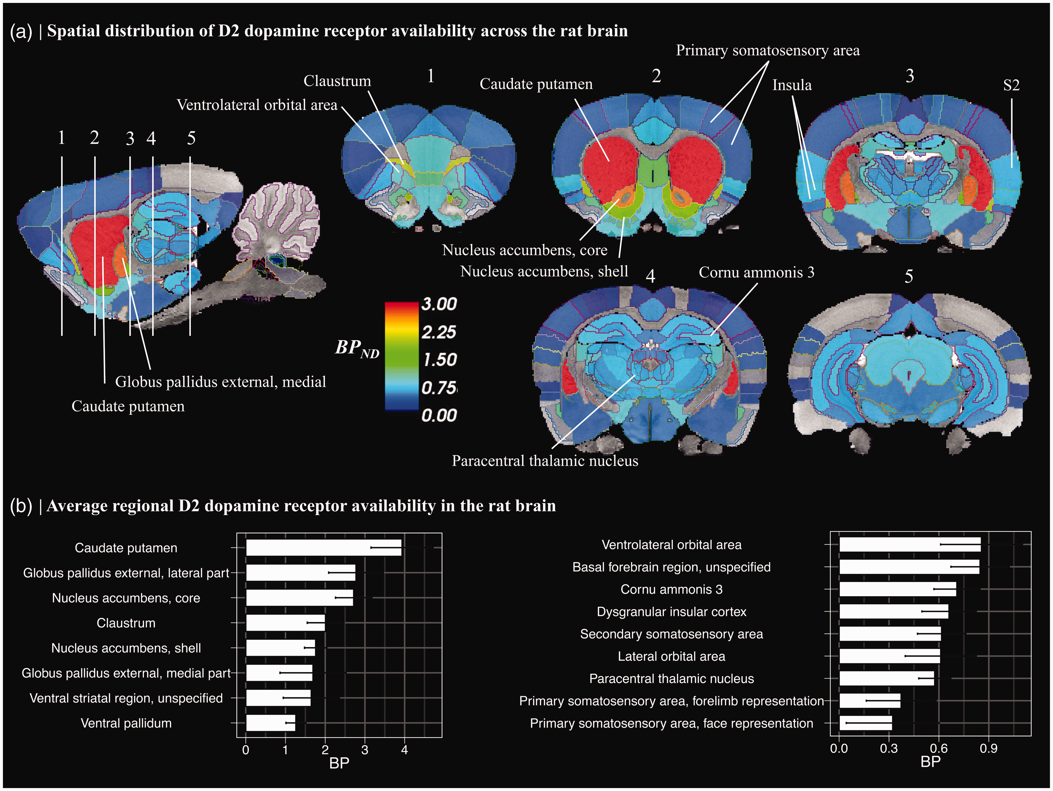 (a) Spatial distribution of [11C]raclopride binding potential (BPND). Average of control animals’ (n = 6 scans) ROI-wise BPND values were overlayed on standard Sprague Dawley rat T2* MR-image. Lines depict region-of-interest borders of the anatomical atlas. BPND was calculated in regions of gray matter, with cerebellum serving as a reference region. Regions where BPND > 0.1 are shown. S2 = secondary somatosensory area and (b) Regional average (±95%CI) for [11C]raclopride BPND values in selected brain regions.