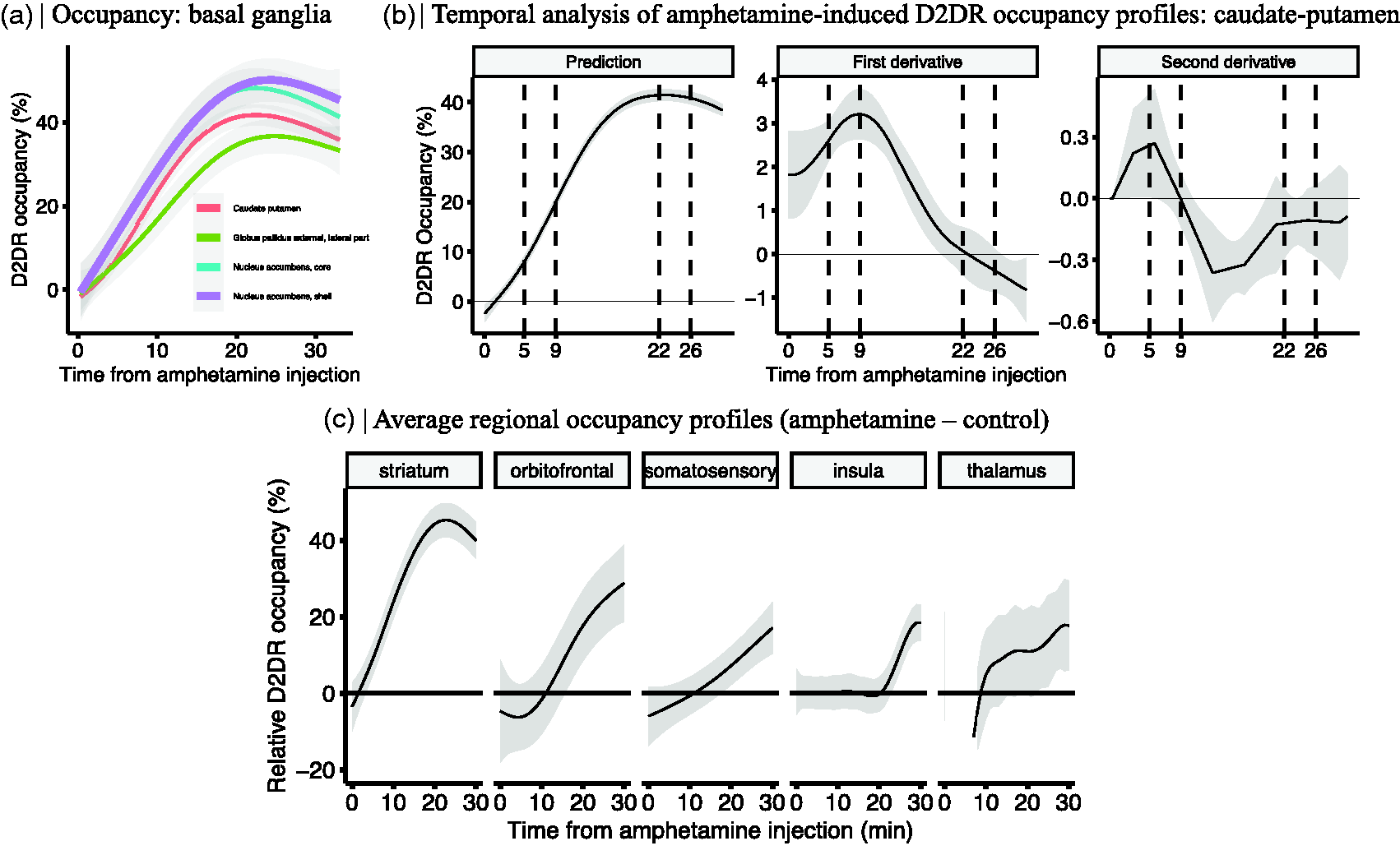 (a) Regional differences in the occupancy profiles of the basal ganglia. (b) Derivatives of the predicted occupancy time profiles of the caudate-putamen and (c) Striatal and extrastriatal amphetamine-induced D2R occupancy (%) time profiles (n = 14) relative to a control group (n = 6). Shaded area represents 95% CI.
