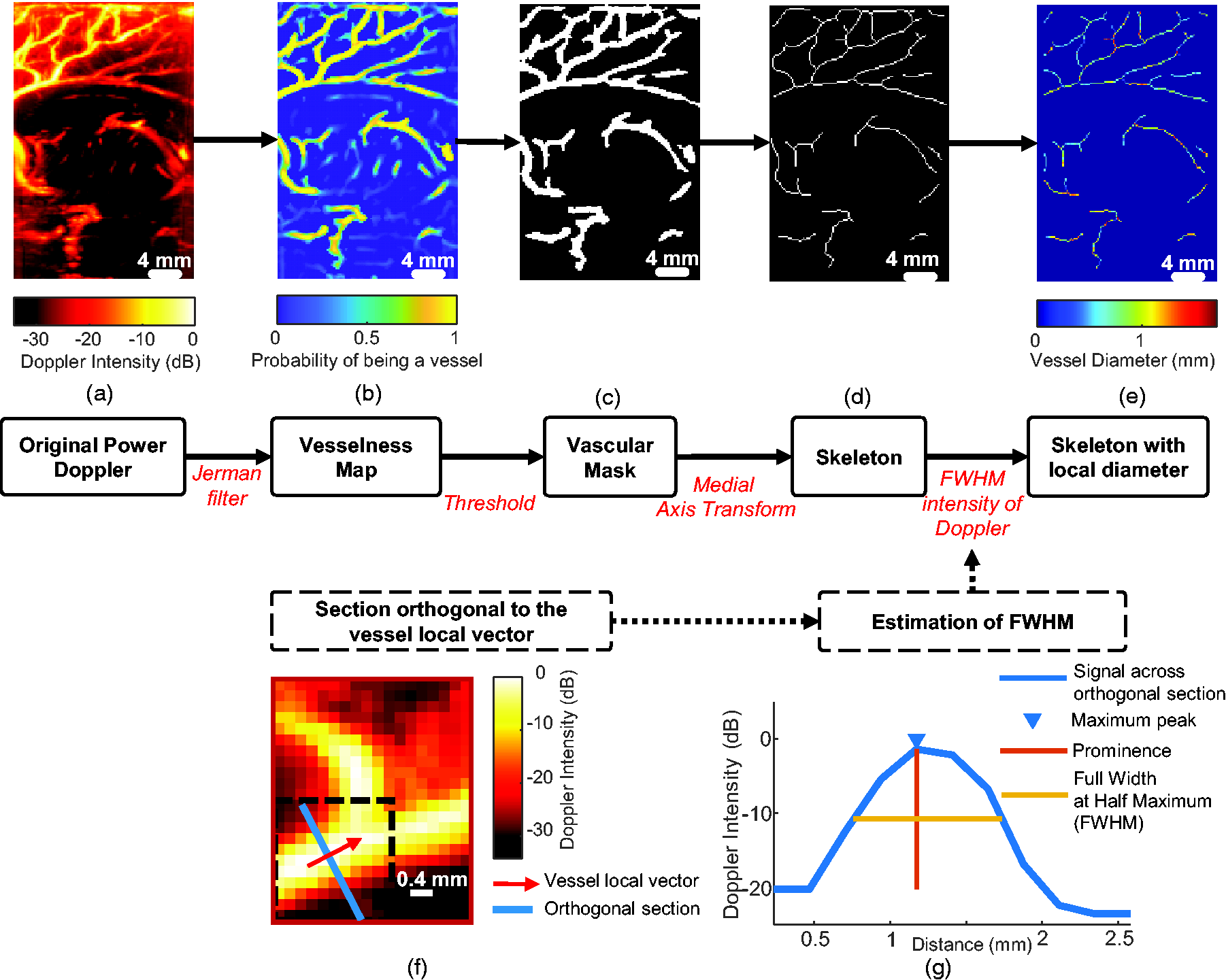 Processing pipeline to determine the local vessel diameter along the vascular tree. (a) Original Power Doppler (PWD) image. (b) A vesselness map (i.e the map of probability for a pixel to belong to a vessel) is obtained by applying a vascular enhancement filter (Jerman Filter) (c) A vascular mask is obtained by thresholding the vesselness map. (d) The skeleton of the vascular mask is extracted by using medial axis transform. (e) The skeleton of the vascular tree shows mapping of the local diameter at each point is obtained after full width at half maximum (FWHM) estimation (see (f) and (g) for details for a given pixel of the skeleton). (f) The local orientation vector of the vessel is determined for a pixel of the skeleton (red arrow) and the section orthogonal to the orientation vector is also defined (blue line) and (g) The PWD intensity along the orthogonal direction is plotted in blue and the diameter is estimated from the FWHM plotted in yellow.
