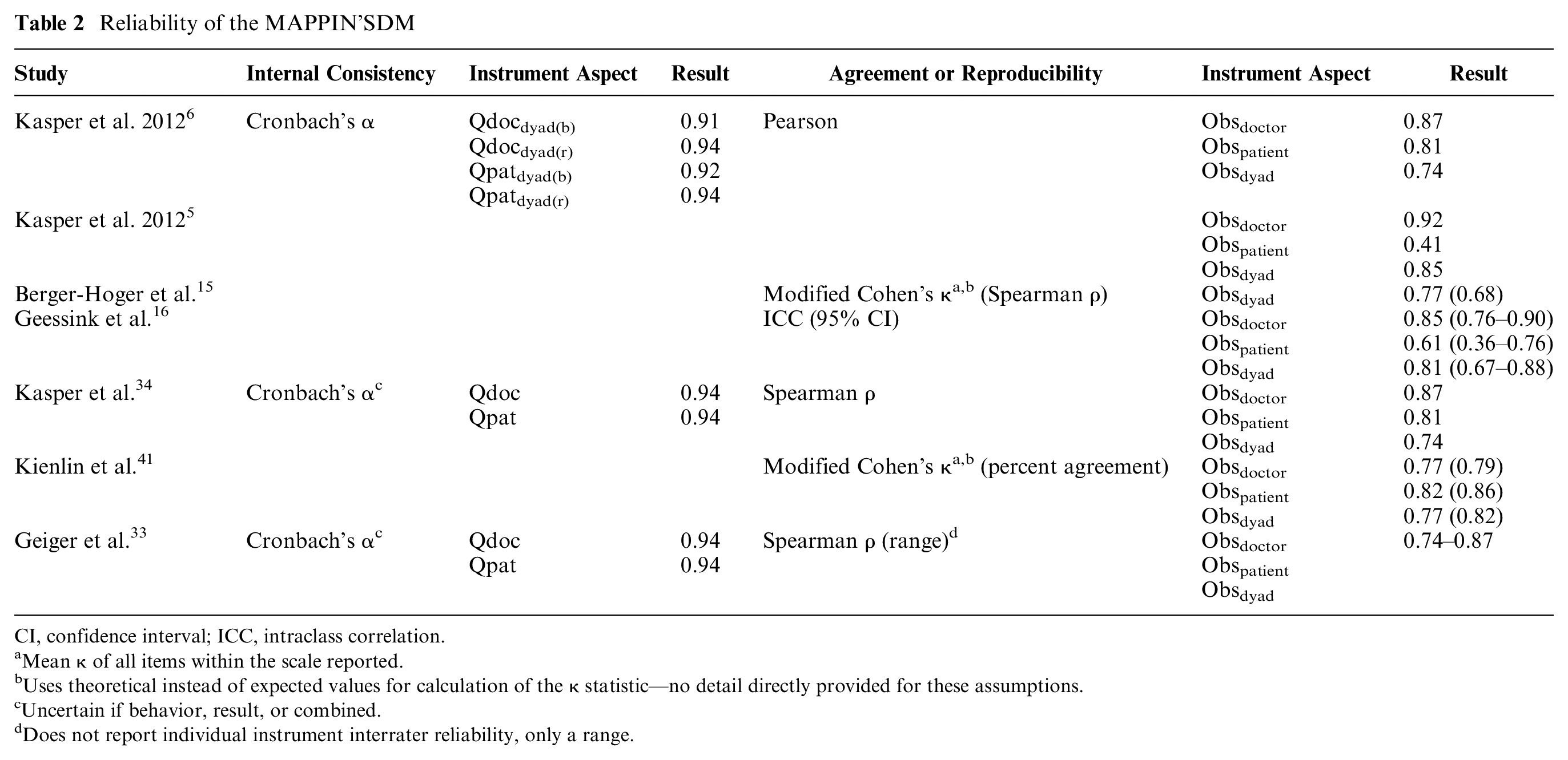 Of those studies that documented interrater reliability, the majority reported correlation statistics, including the Pearson correlation coefficient and Spearman ρ (Table 2). Only 1 study used intraclass correlation (ICC) as a measure of interrater reliability, which is the preferred practice given it measures both correlation and agreement, as opposed to correlation alone.16,39 The ICC was sufficient for both physician and dyad (0.81–0.85; Table 2) but was insufficient for interrater agreement of patient involvement in the SDM process (0.61; Table 2).