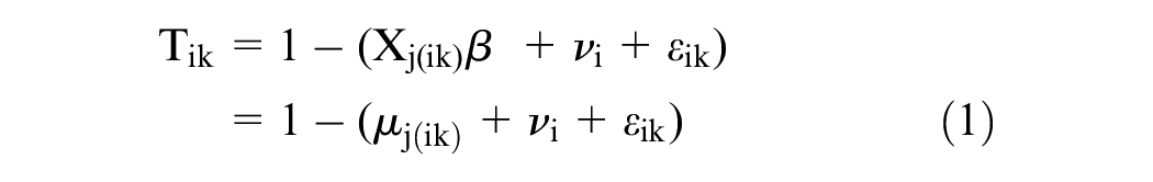 Let Tik be participant i’s disutility (i.e., 1-utility) for the kth health state that they value (thus k = 1, 2, . . ., 12 since each respondent valued 10 health states using cTTO and 2 health states using tTTO). Let j(ik) index be the state number corresponding to the kth health state valued by individual i, with j(ik) taking values in 1, . . ., 86. Let