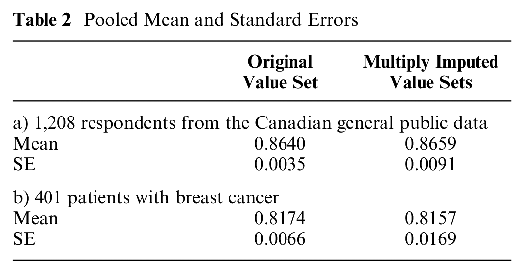 We therefore used the Shams model to create 100 imputed value sets. For both the Canadian general public and patients with breast cancer, the multiply imputed value set yielded a larger SE than the originally published value set did (Table 2): a 2.60-fold increase in the SE for the Canadian general public data set and a 2.56-fold increase for the breast cancer data set.