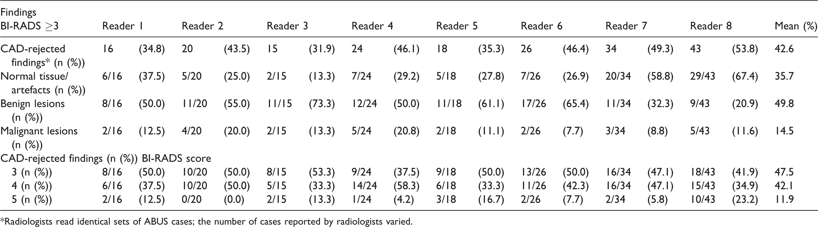 Validation by CAD reduced the number of positive findings, defined as those scored as BI-RADS ≥3 by the readers, with on average 42.6% (range = 31.9%–53.8%) (Figs. 2 and 3). Based on the consensus reading, on average, 49.8% (range = 11.6%–73.3%) of CAD-rejected cases are related to the presence of a benign lesion, 35.7% (range = 13.3%–67.4%) are caused by acoustic shadowing artefacts in normal tissue, and 14.4% (range = 7.7%–20.9%) are malignant lesions missed by the CAD system. The majority (average = 47.5%; range = 37.5%–53.3%) of the CAD-rejected findings were scored by the radiologists as BI-RADS 3, followed by BI-RADS 4 (average = 41.3%; range = 26.7%–58.3%) and BI-RADS 5 (average = 10.4%; range = 4.2%–23.2%) (Table 2).
