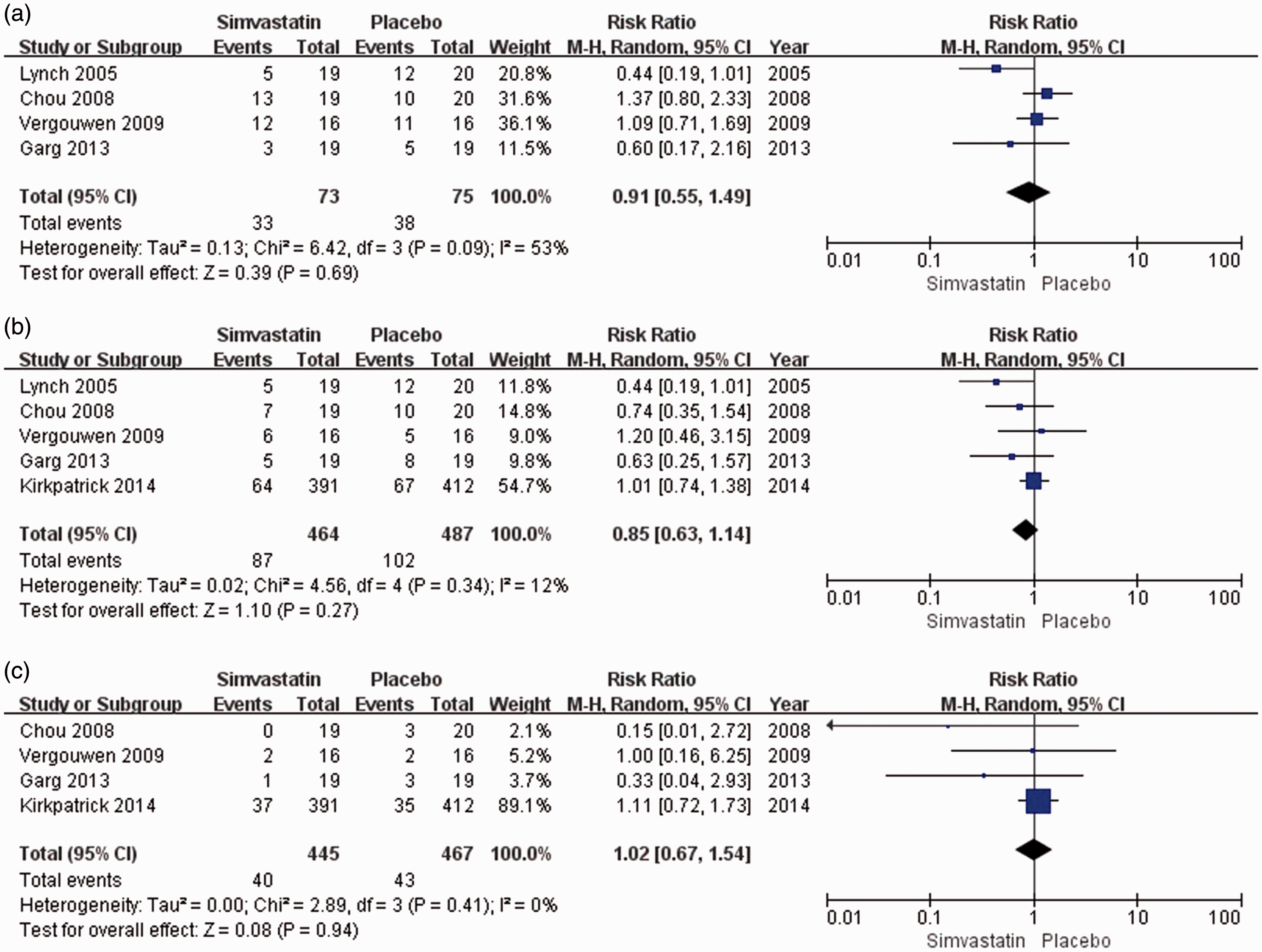 Four studies7–10 involving 912 patients were available for analysis of all-cause mortality. Simvastatin did not decrease all-cause mortality (RR, 1.02; 95% CI, 0.67–1.54) (Figure 2(c)). No evidence existed for data heterogeneity (