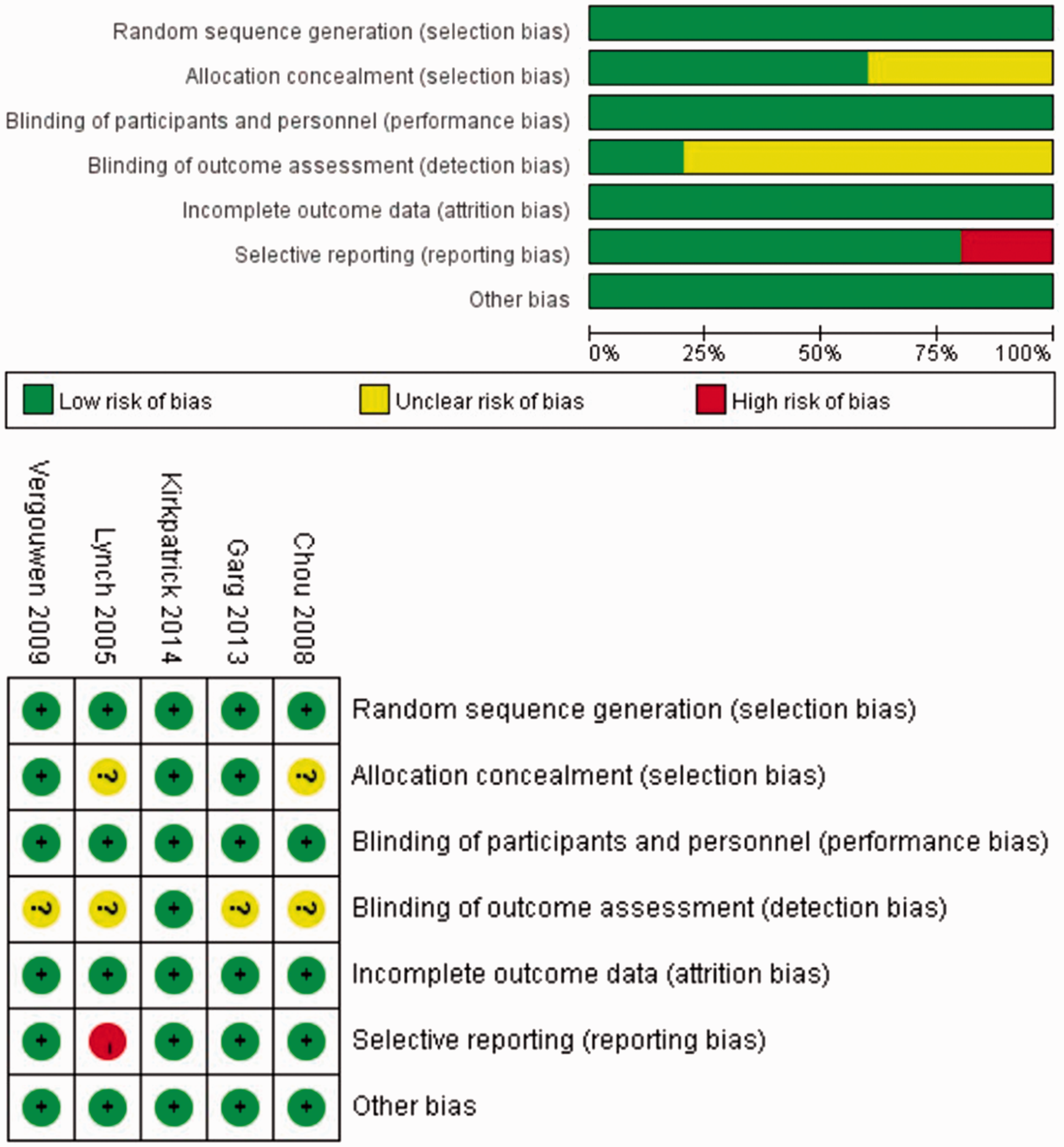 The risk of bias with respect to allocation concealment was unclear in two studies.6,7 The risk of bias with respect to blinding of the outcome assessment was unclear in four studies.6–9 The risk of bias with respect to selective reporting was high in one study.
