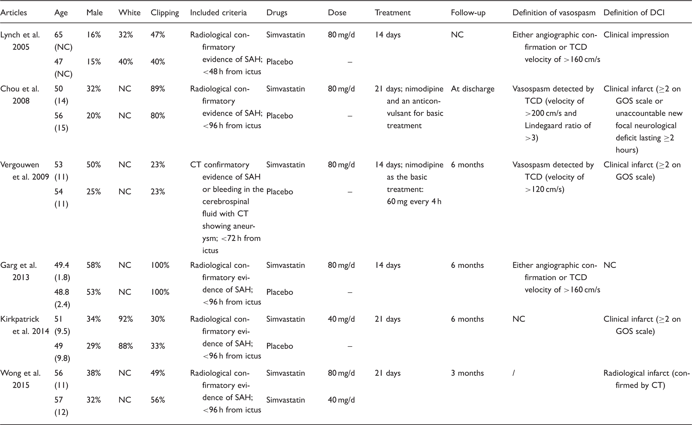 Study search, selection, and inclusion process. RCT: randomized controlled trial. Characteristics of the included studies. CT: computed tomography; CTA: computed tomography angiography; DCI: delayed cerebral ischemia; DSA: digital subtraction angiography; GOS: Glasgow outcome scale; MRA: magnetic resonance imaging; NC: not clear; SAH: subarachnoid hemorrhage; TCD: transcranial cerebral Doppler.