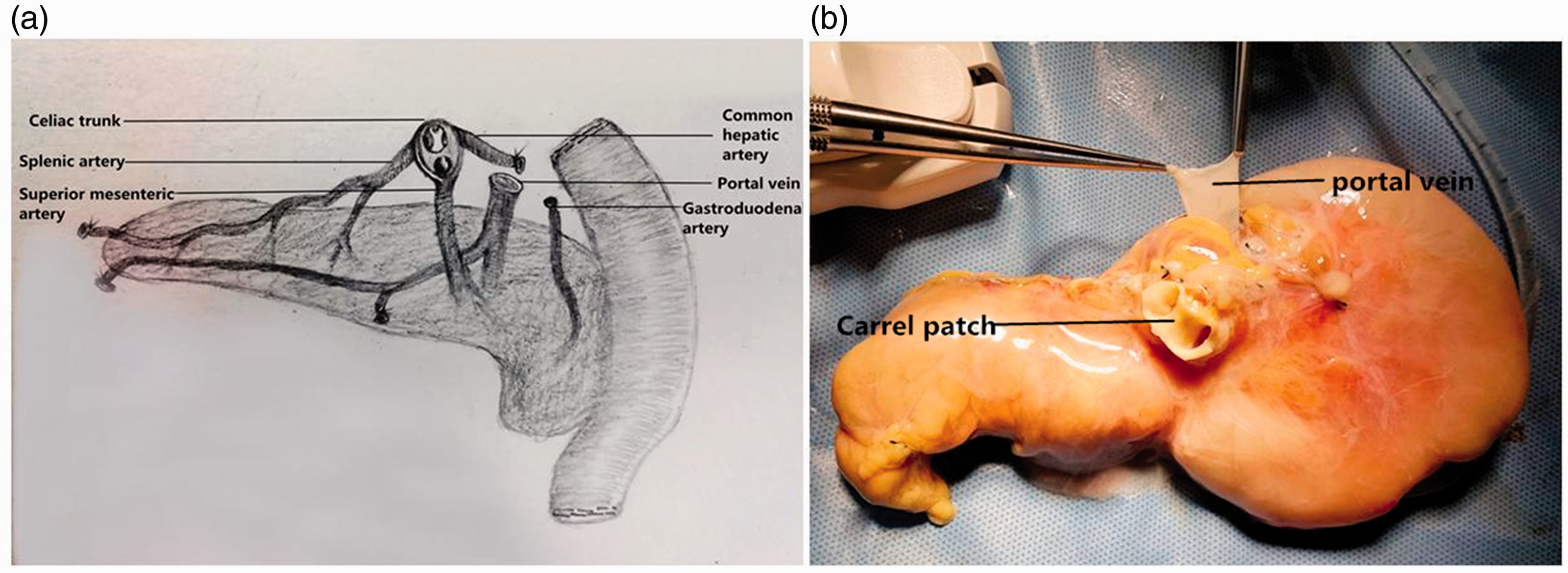 Twelve donor pancreas preparations without vascular reconstruction were performed. The patch (Carrel patch), celiac trunk, and superior mesenteric artery were preserved as arterial inflow channels for the donor pancreas. The common hepatic artery and the gastroduodenal artery were transected at a site 0.5 cm away from the bifurcation. The bifurcated portion was preserved for the donor liver. The stumps of the gastroduodenal artery and common hepatic artery were then ligated. The portal vein was transected in the middle of the hepatoduodenal ligament during separation of the liver and pancreas. The partial portal vein preserved with the pancreas was used as the outflow channel of the donor pancreas.