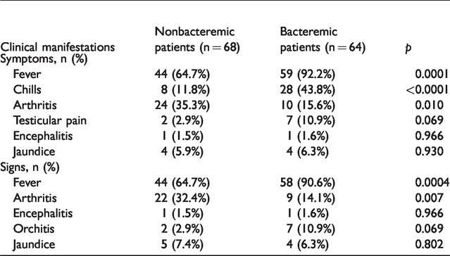The most frequent clinical manifestations were fever (78.0%) and chills (27.3%). More bacteremic than nonbacteremic patients presented with fever and chills as symptoms (fever,
