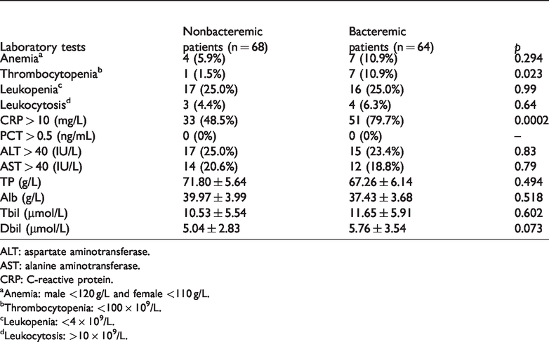 Compared with nonbacteremic cases, elevated CRP levels were detected significantly more often in bacteremic cases. As a nonspecific inflammatory marker, CRP alone is a suboptimal predictive factor for