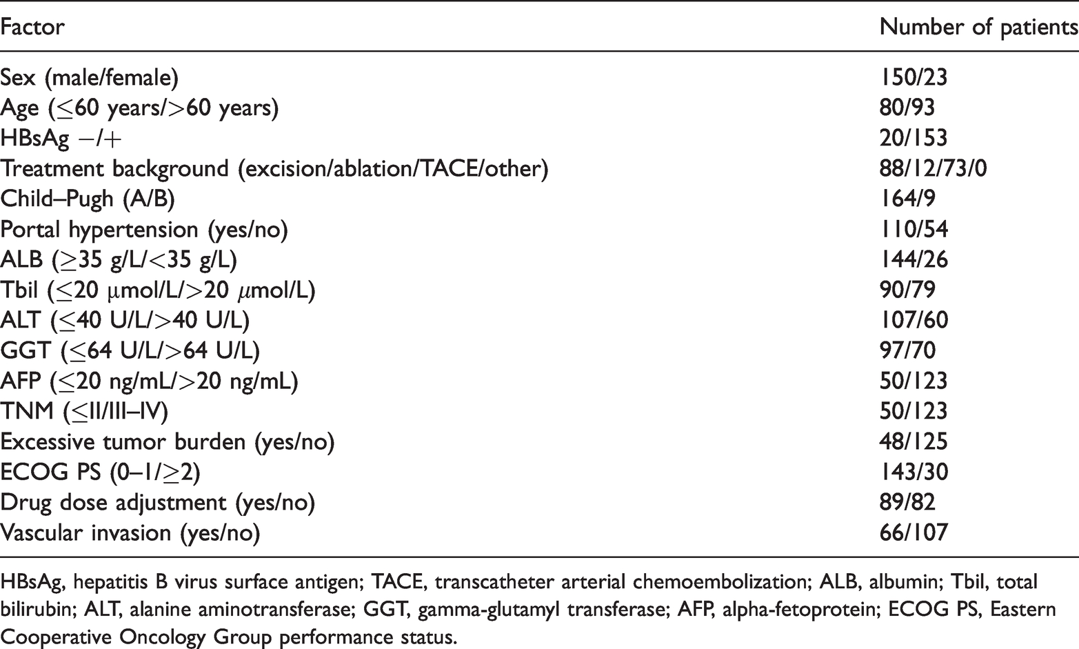 HBsAg, hepatitis B virus surface antigen; TACE, transcatheter arterial chemoembolization; ALB, albumin; Tbil, total bilirubin; ALT, alanine aminotransferase; GGT, gamma-glutamyl transferase; AFP, alpha-fetoprotein; ECOG PS, Eastern Cooperative Oncology Group performance status.