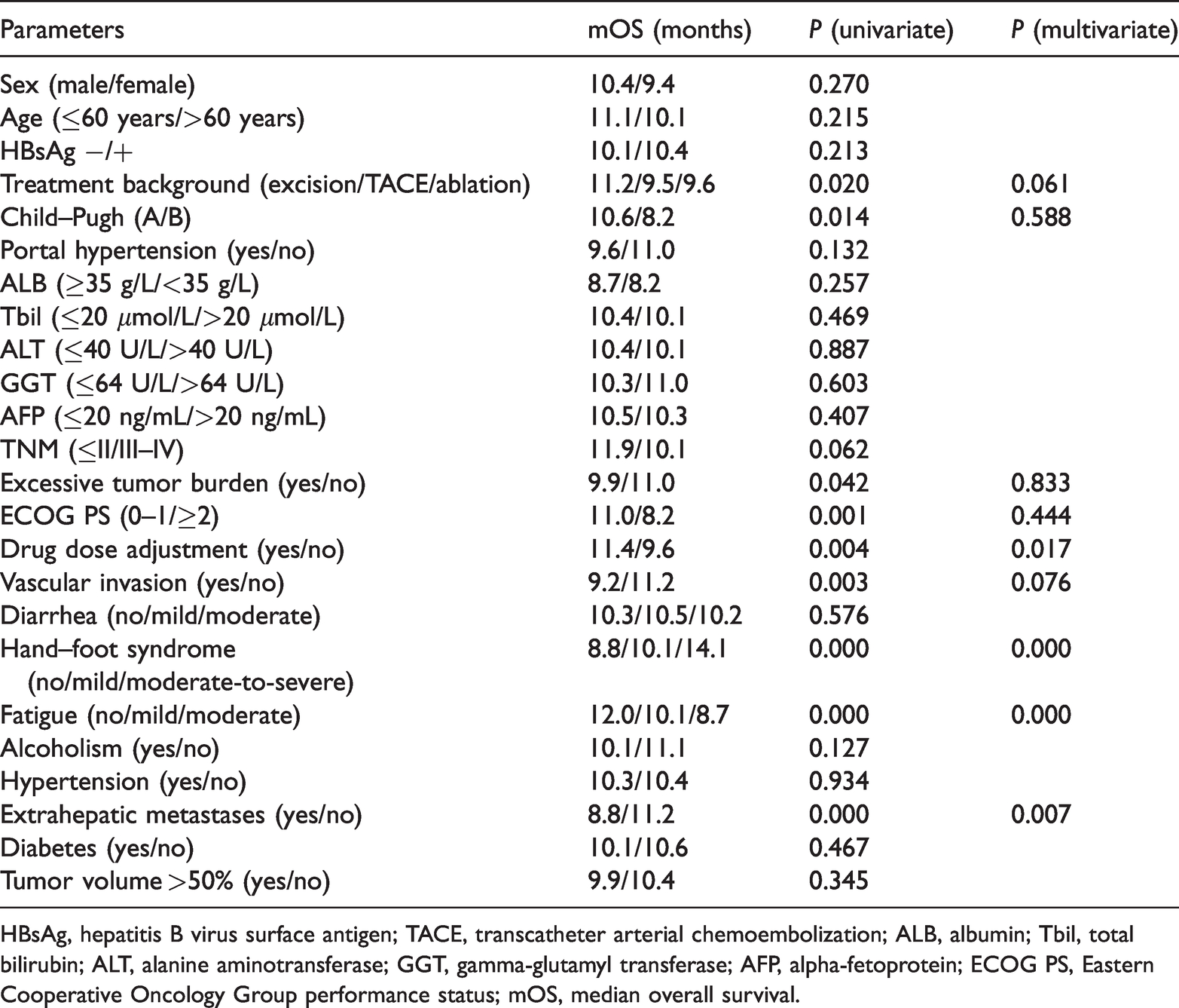 The survival factors of the patients in this group were analyzed. Based on the results of multivariate analysis presented in Table 2, fatigue and hand–foot syndrome (HFS) were independent risk factors for the outcomes of patients with HCC.