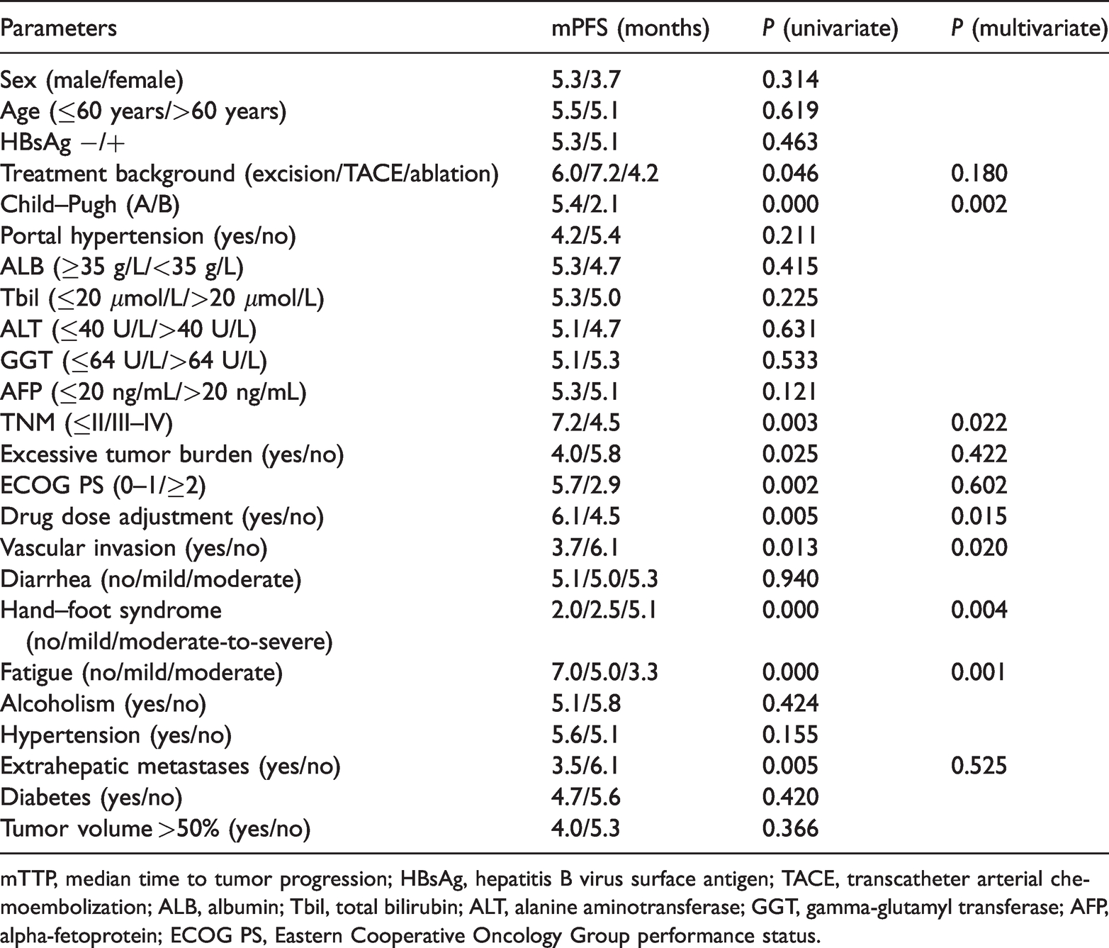 mTTP, median time to tumor progression; HBsAg, hepatitis B virus surface antigen; TACE, transcatheter arterial chemoembolization; ALB, albumin; Tbil, total bilirubin; ALT, alanine aminotransferase; GGT, gamma-glutamyl transferase; AFP, alpha-fetoprotein; ECOG PS, Eastern Cooperative Oncology Group performance status.