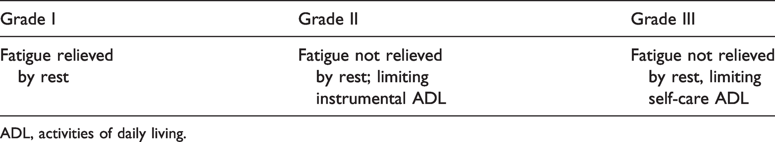 To better study the effects of fatigue on this group of patients, we divided patients into grades I (n = 65), II (n = 63), and III (n = 45) according to NCI CTCAE v5.0 (Figure 2, Table 6).